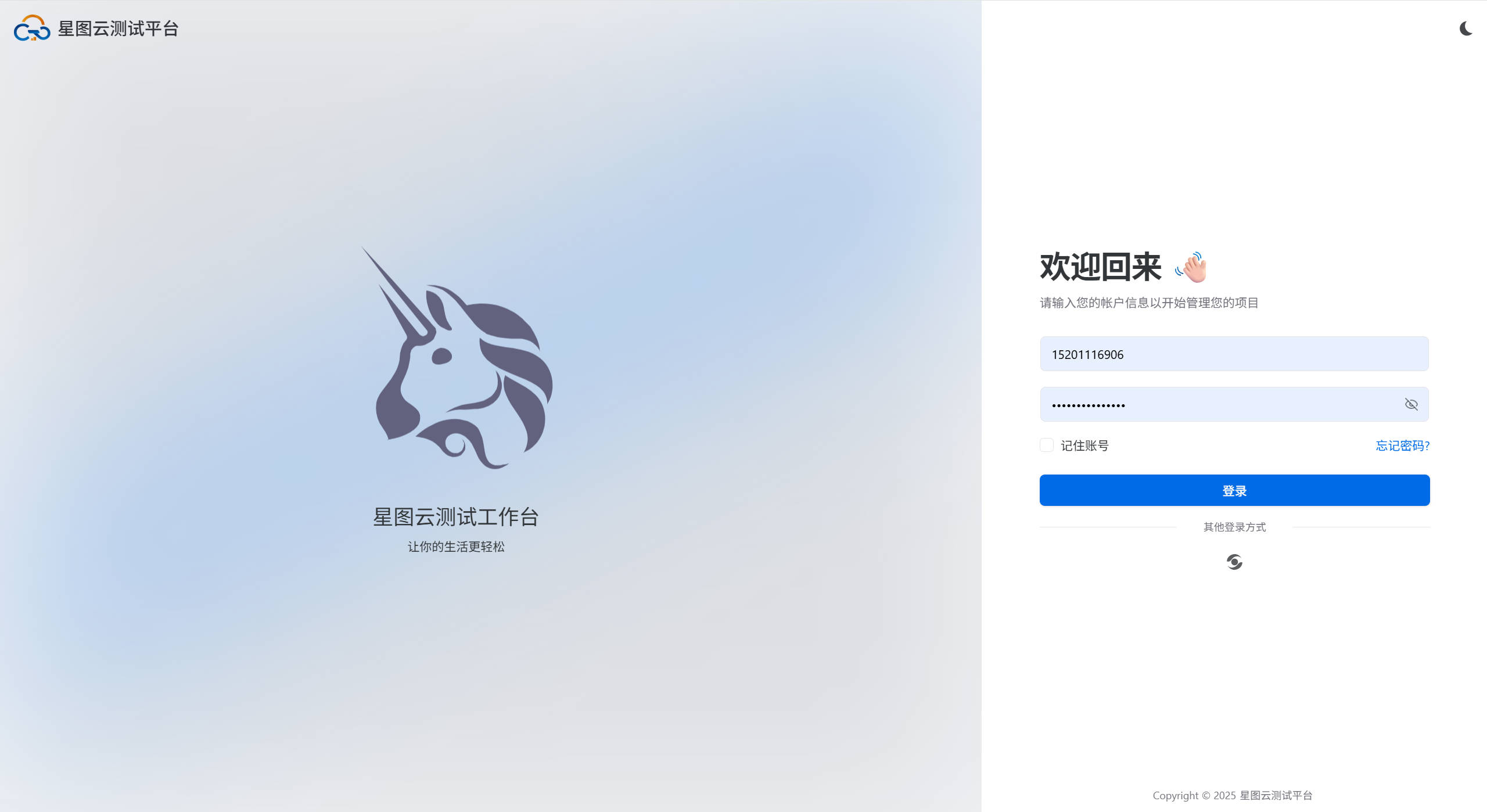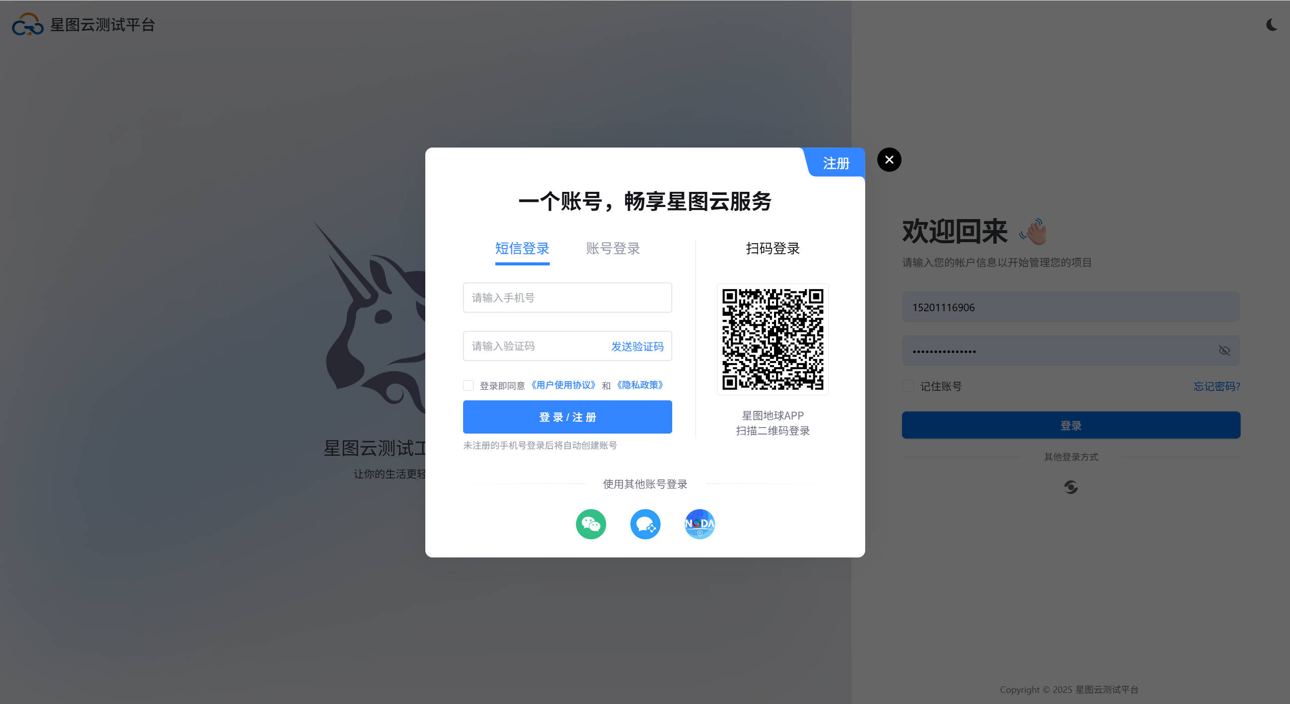 用户可以从星图云测试平台首页,点击【进入工作台】,通过星图云统一登录服务进入工作台,当前支持手机、微信、企业微信等方式进行登录。