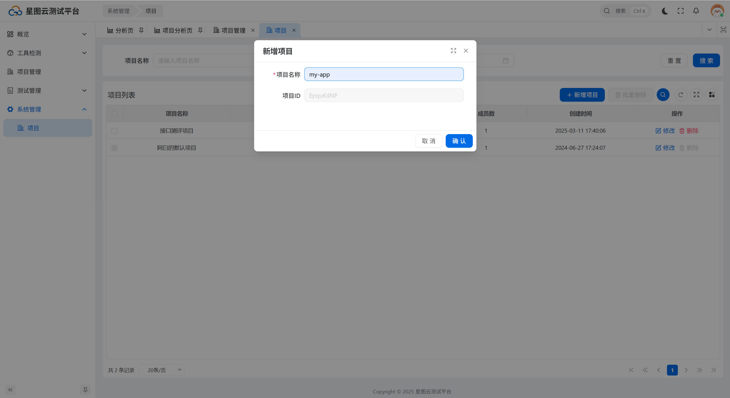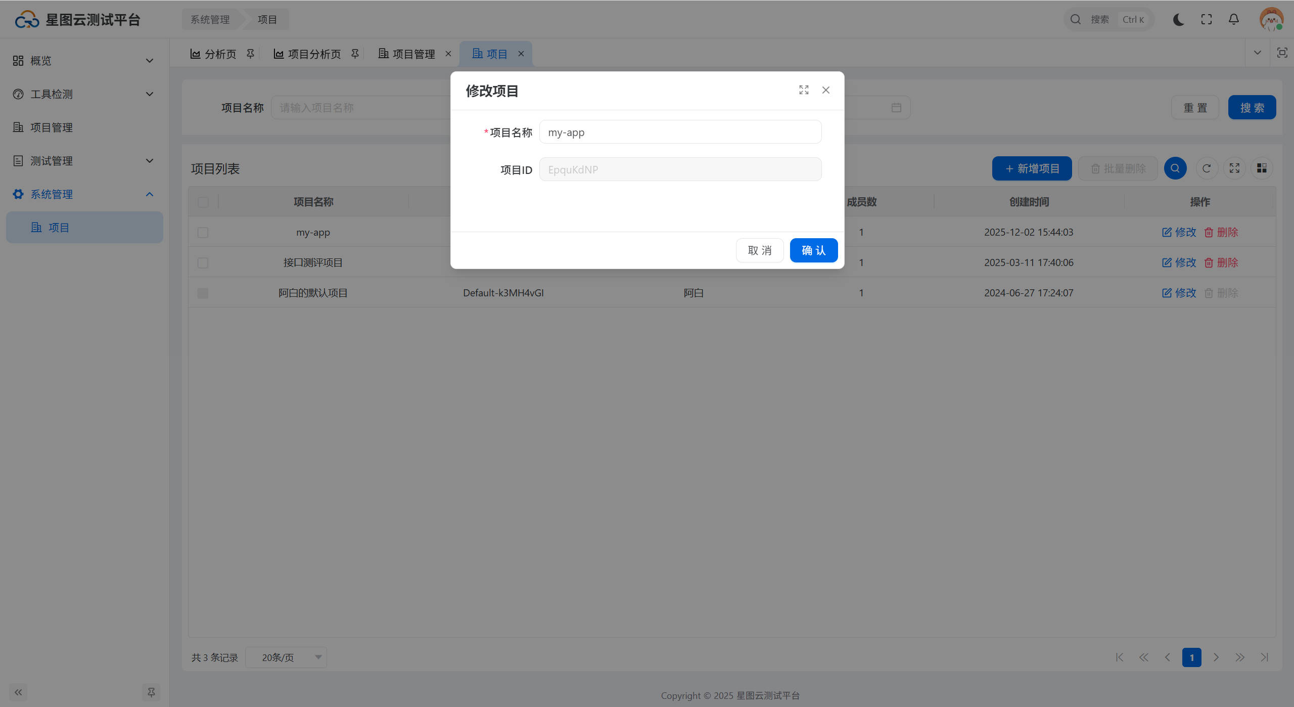 点击【系统管理】的【项目】菜单,进入到项目页面,项目操作包括项目创建、编辑、删除。