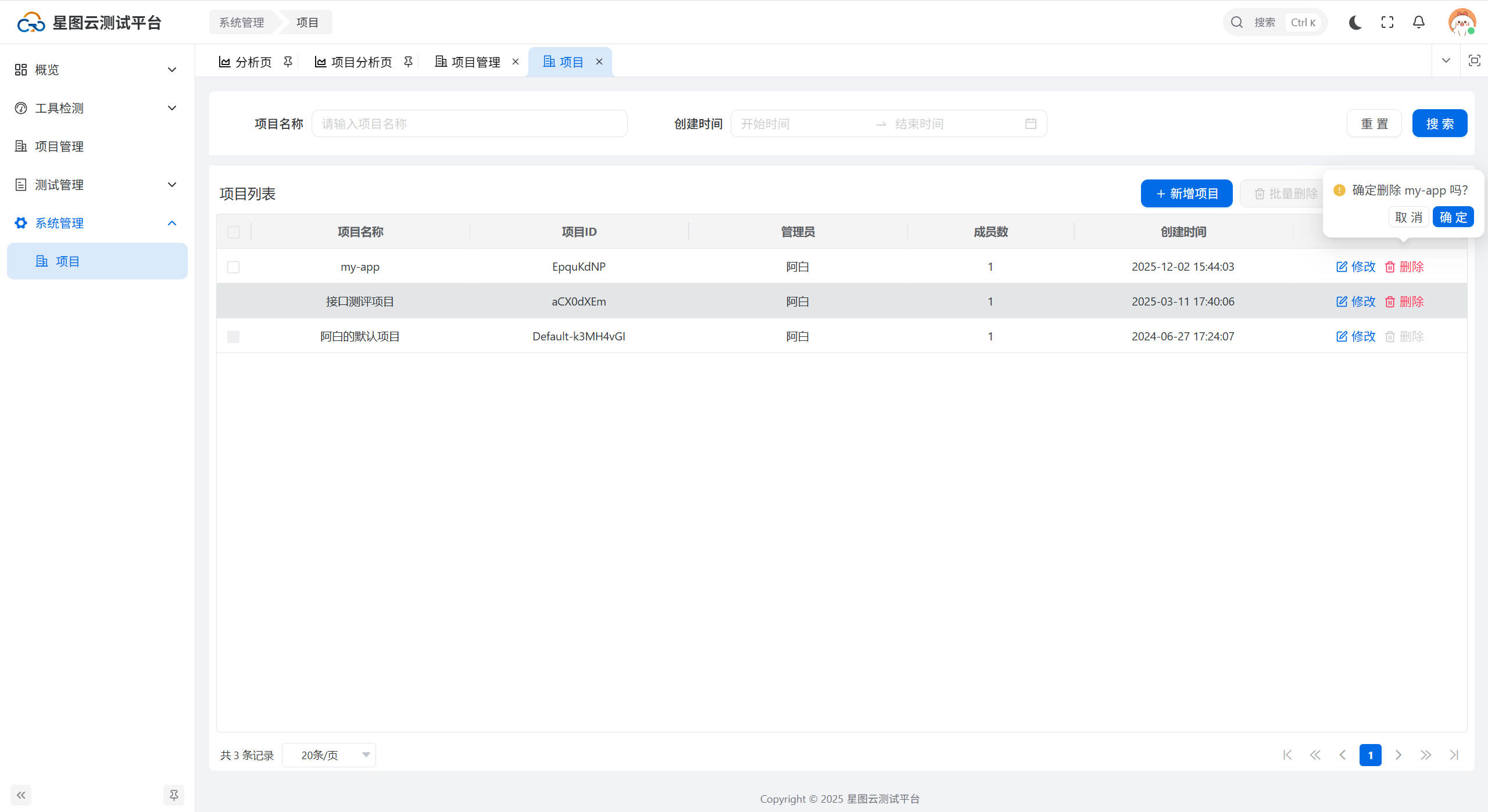 删除项目:点击【删除】按钮,弹出二次确认窗口,点击【确定】,项目删除成功,如下图所示:
