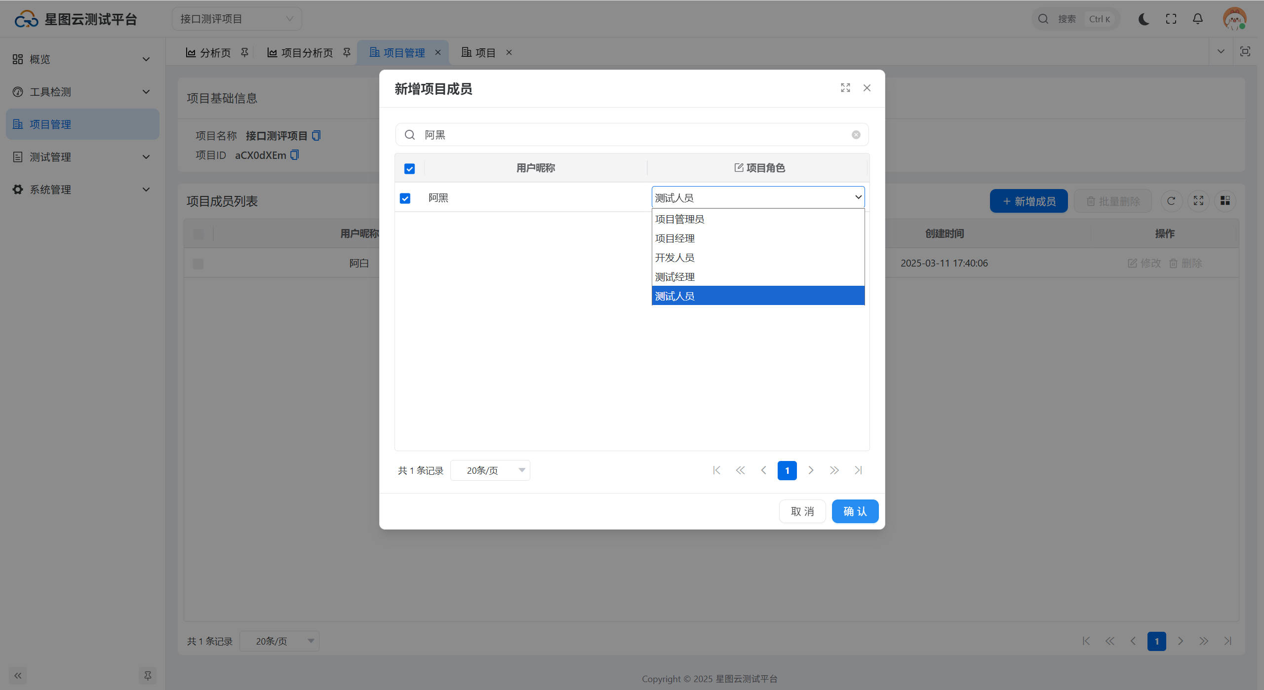 新增成员:点击【新增成员】按钮,弹出新增项目成员窗口,选择需要增加的成员并赋予相应的项目角色,点击【确定】按钮,成员新增成功,如下图所示: