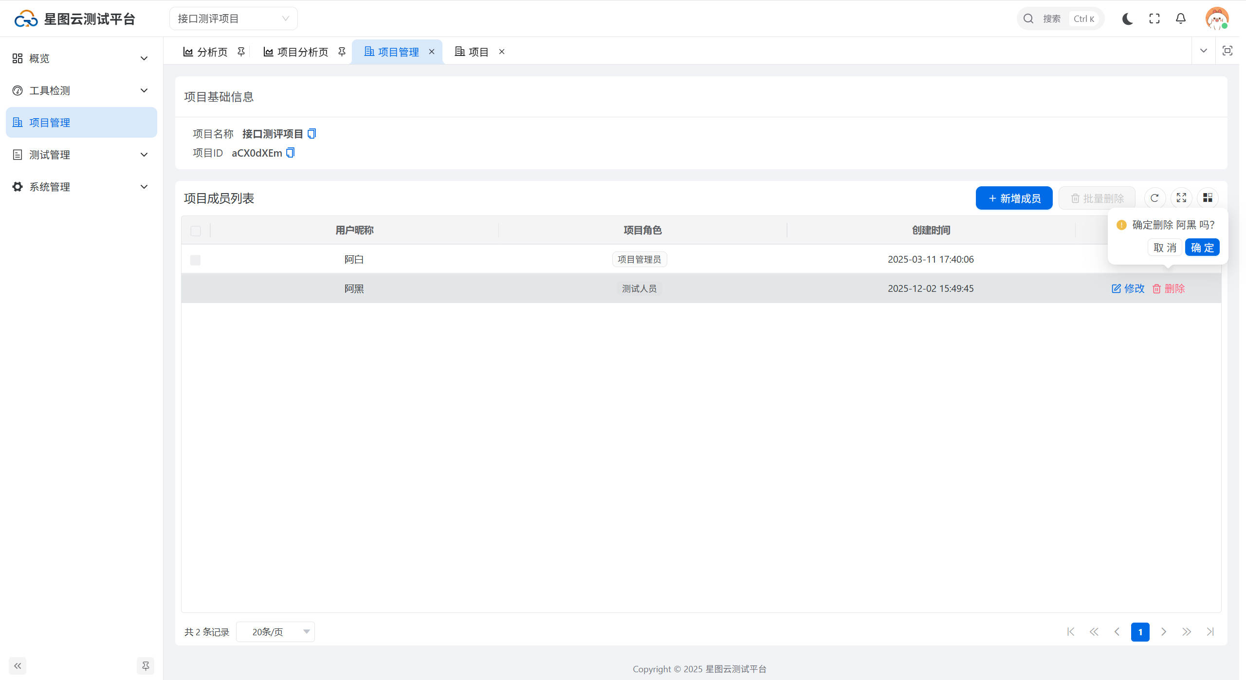 点击【项目管理】菜单,进入到项目管理页面,成员管理操作包括新增成员和删除。
