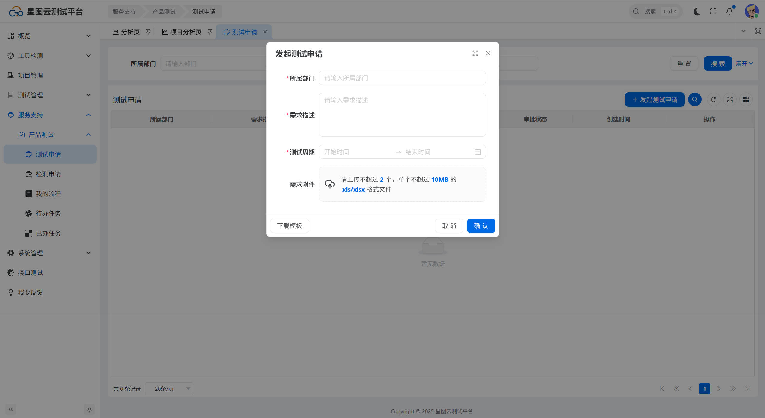 进入测试申请页面,点击【发起测试申请】按钮,弹出发起测试申请窗口,填写所属部门、需求描述,选择测试周期,根据需要上传需求附件,点击【确认】按钮,发起测试申请流程,如下图所示: