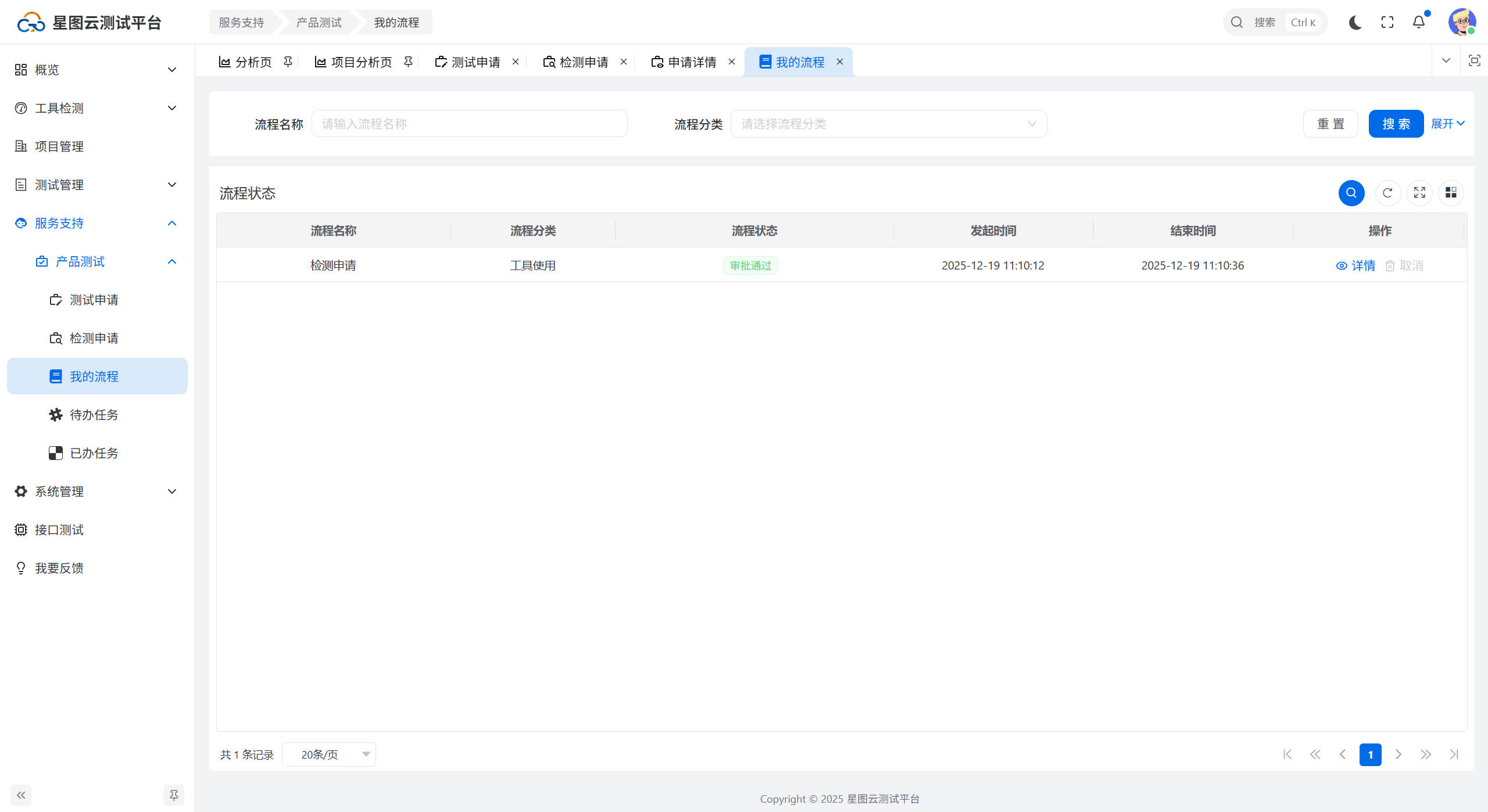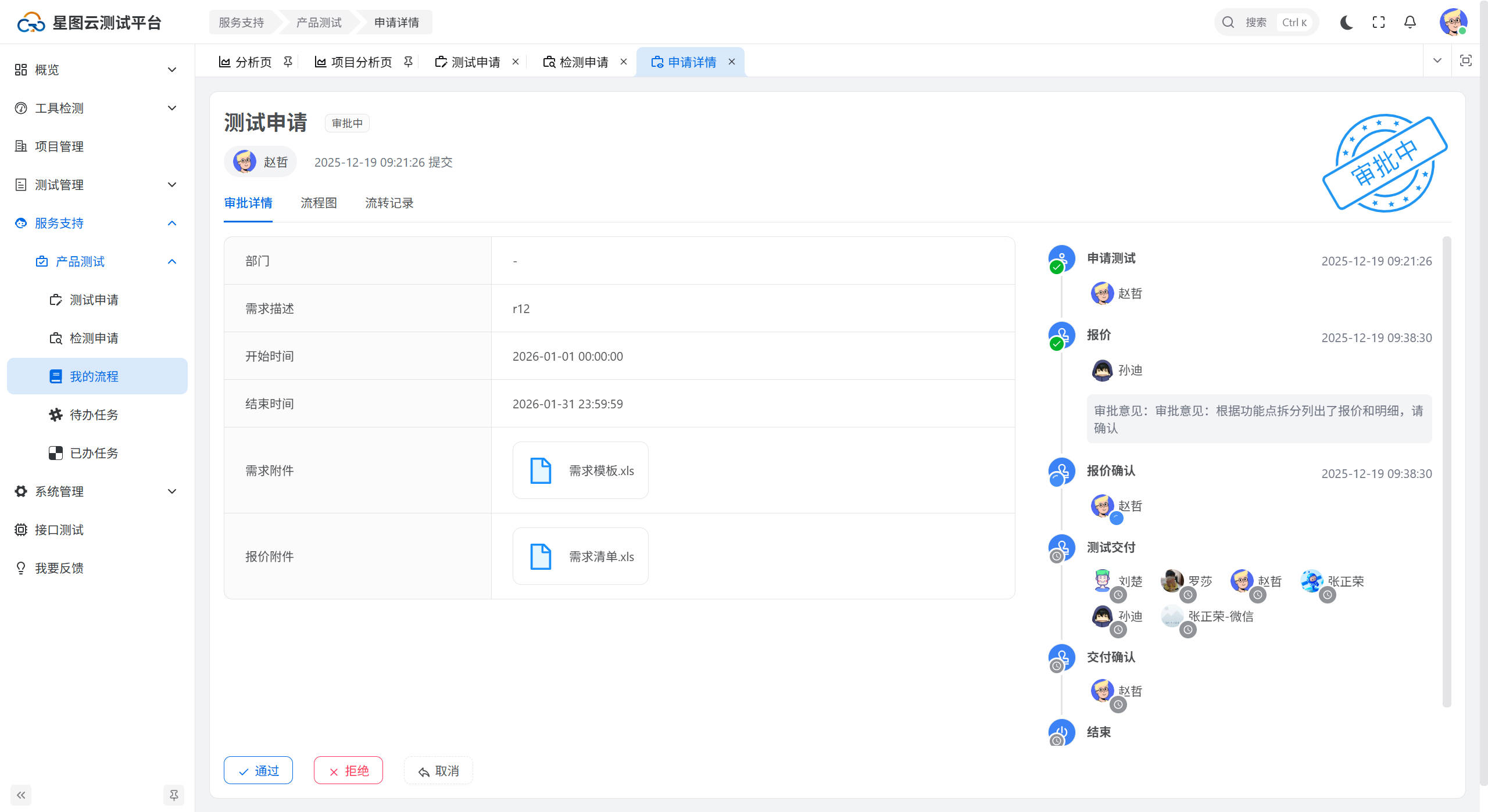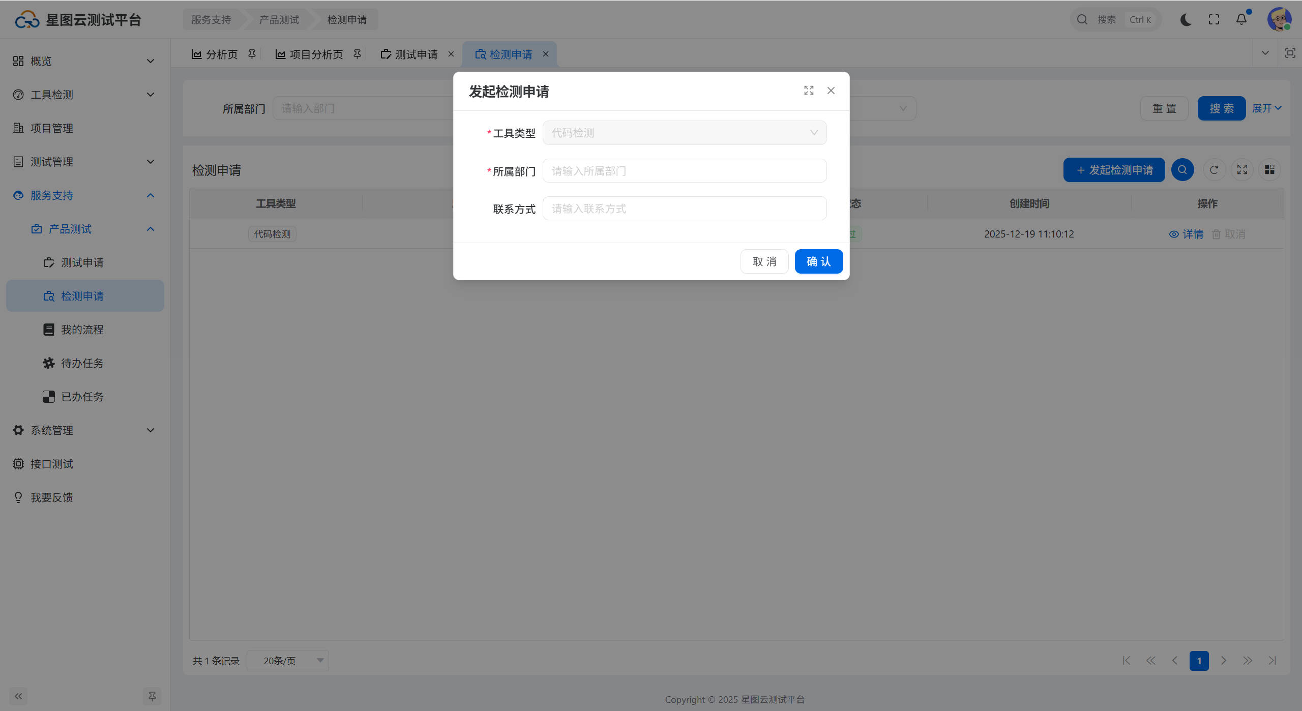 进入检测申请页面,点击【发起检测申请】按钮,弹出发起检测申请窗口,填写所属部门、联系方式,点击【确认】按钮,发起检测申请流程,如下图所示: