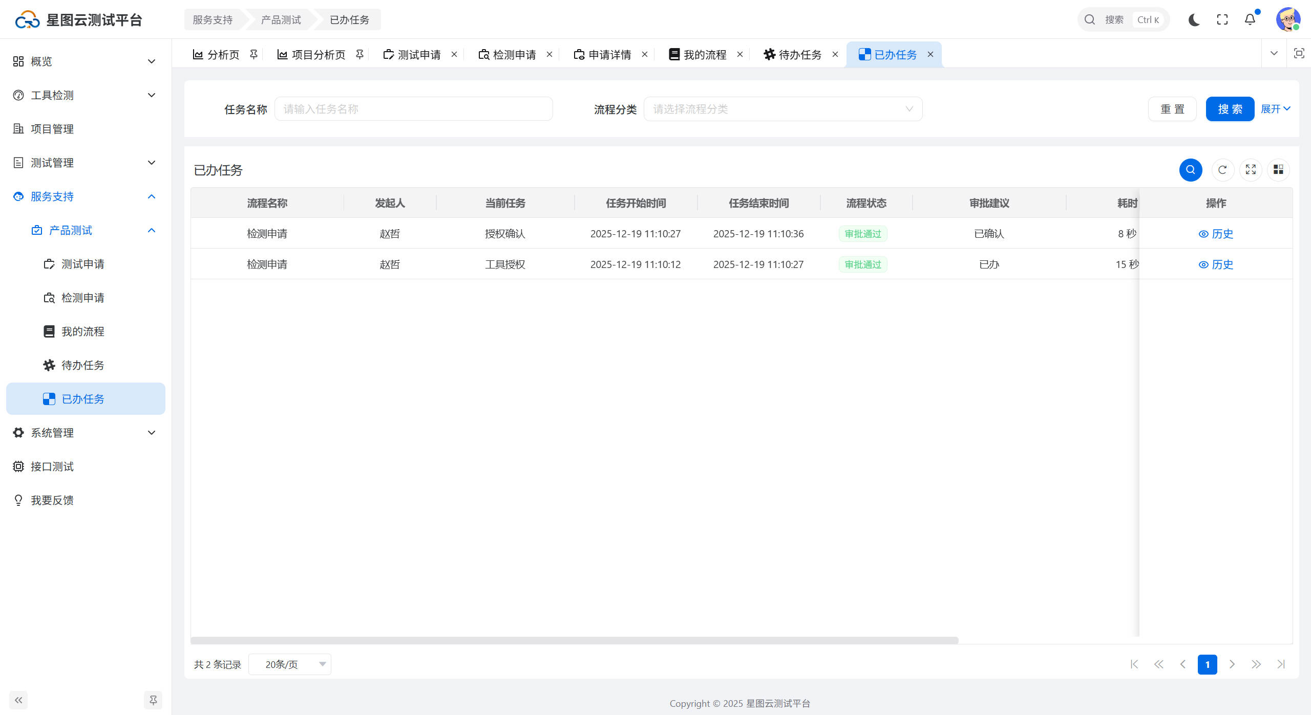 进入已办任务页面,可以查看所有自己已处理的任务,如下图所示: