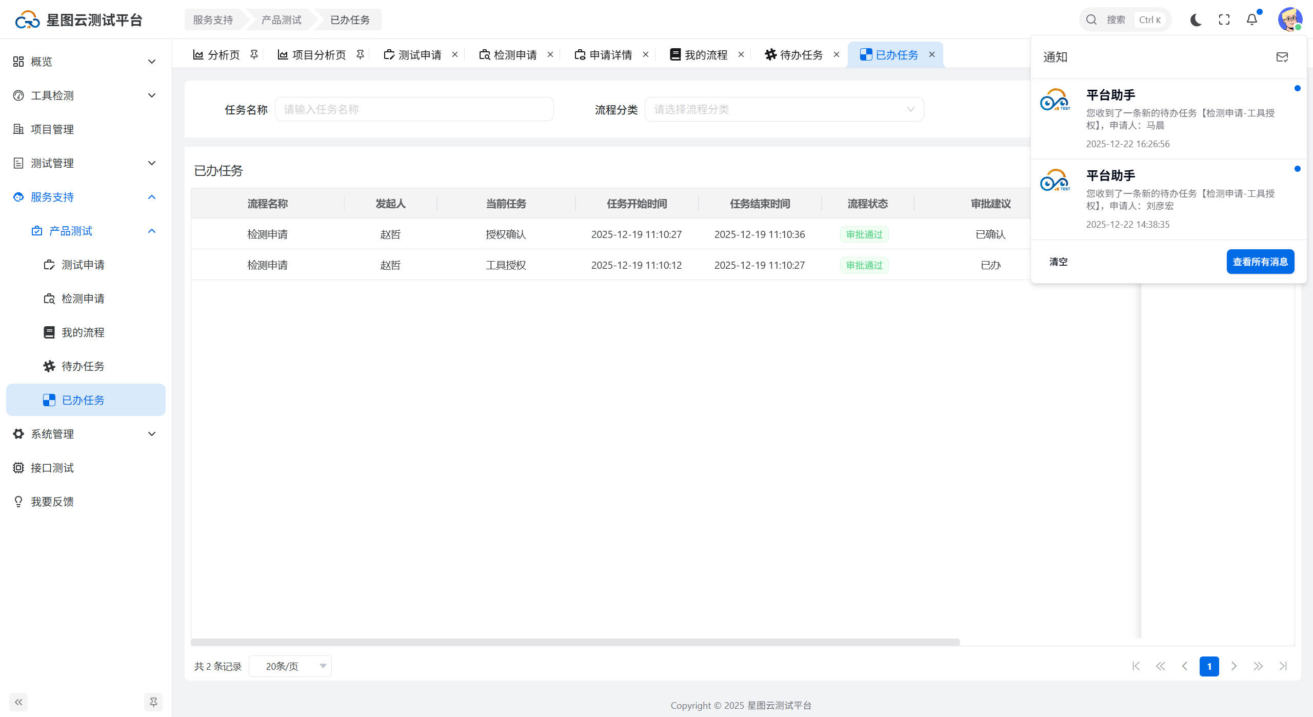 当自己发起的申请流程状态变为通过/不通过、自己被分配了任务、或者自己的任务处理超时,会接收到平台通知,如下图所示: