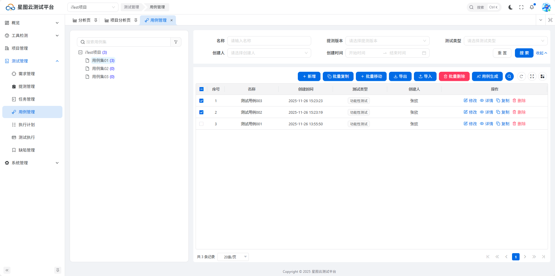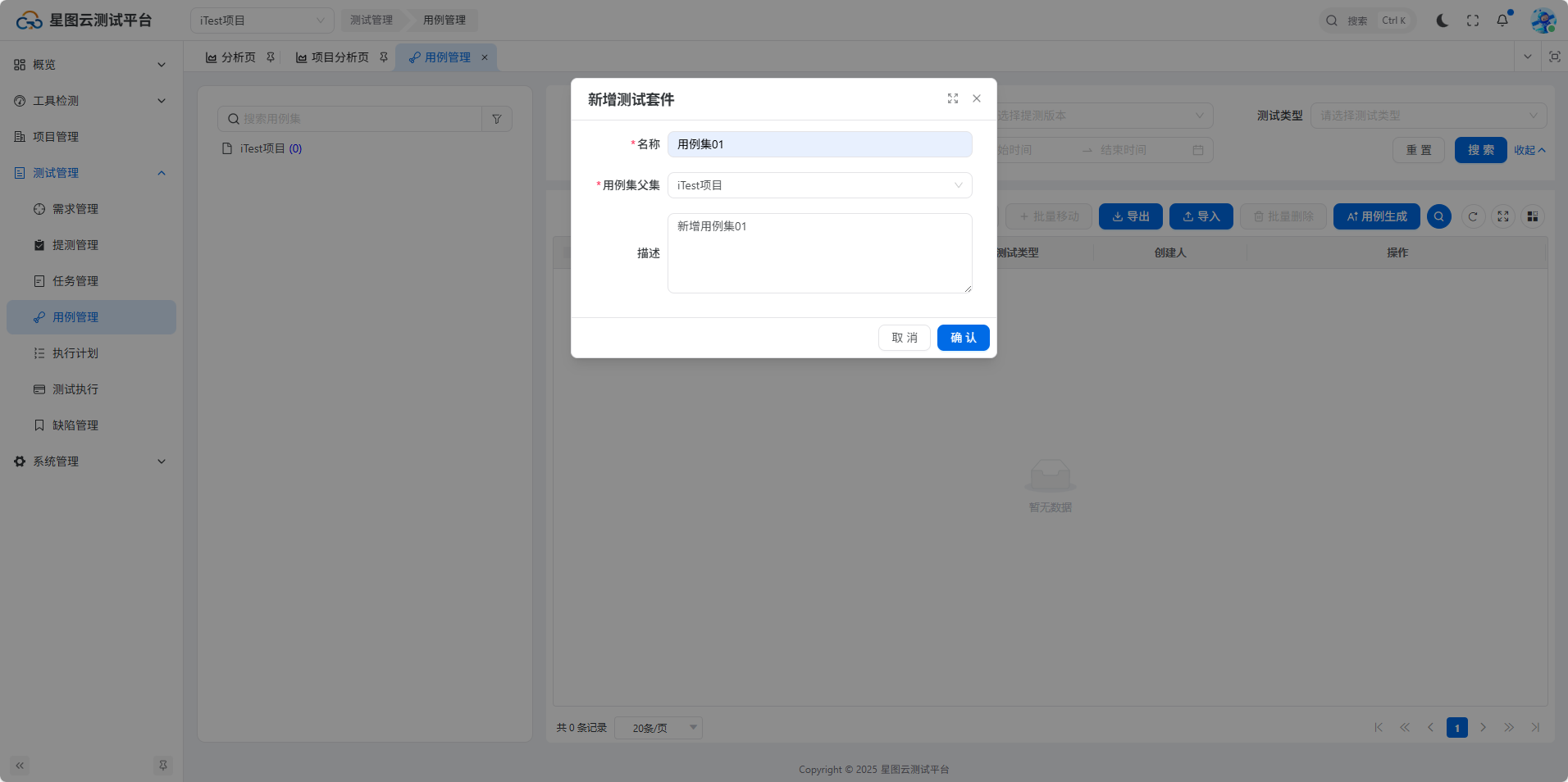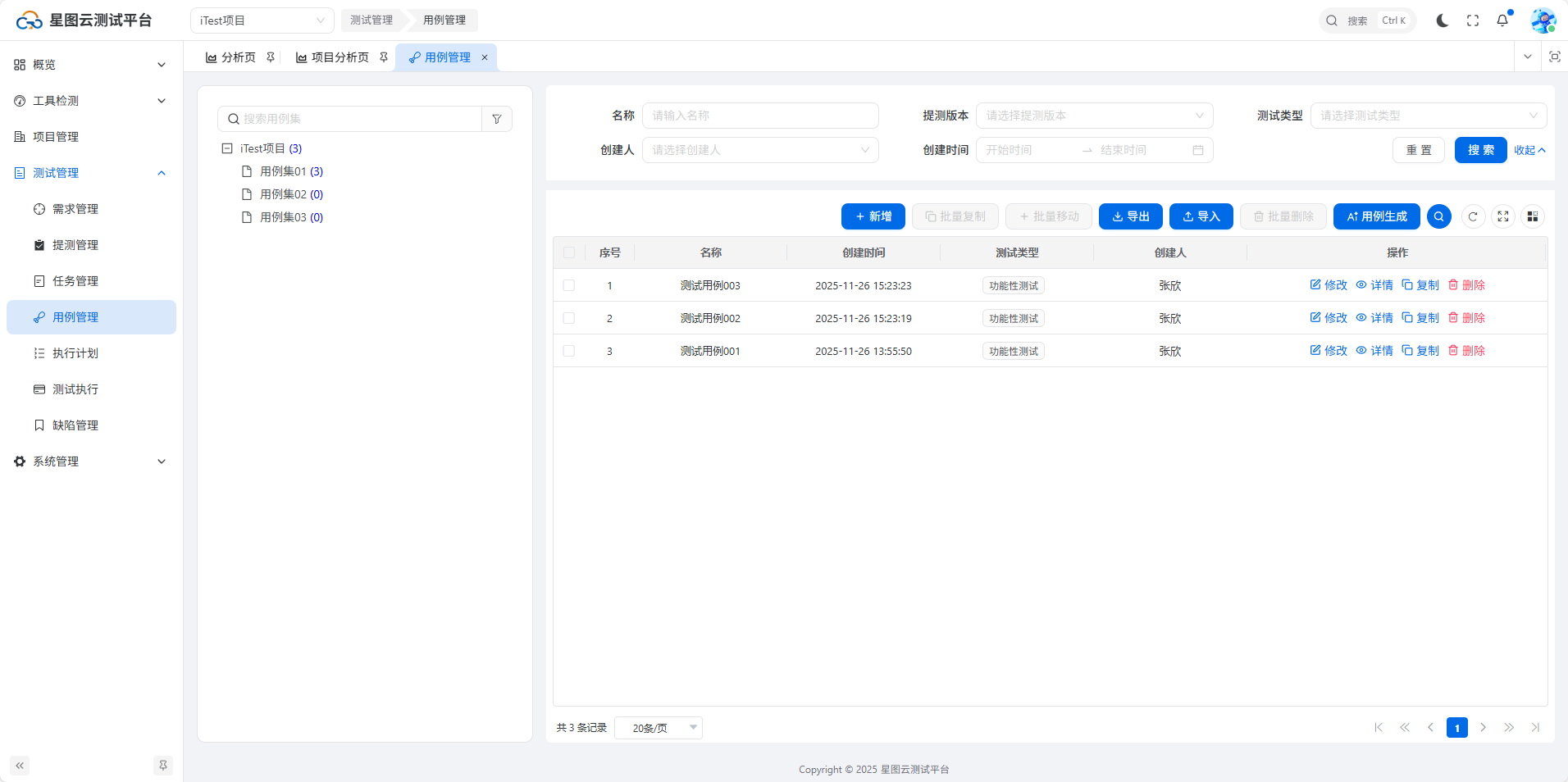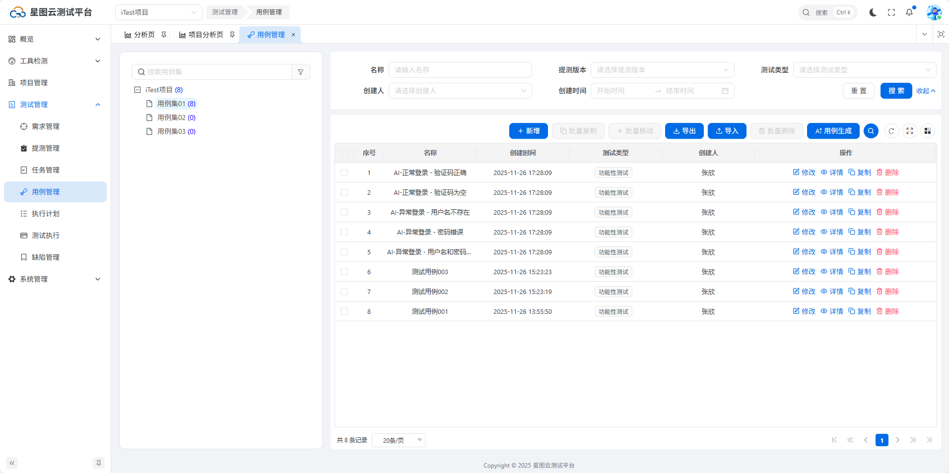 用户可以从左侧导航【测试管理】下的【用例管理】,进入用例管理页面,用例管理由左侧用例集管理和右侧用例管理两部分组成。用例集管理包括新增、修改、删除、查询操作, 用例管理包括新增、修改、详情、复制、删除、移动、导出与导入、查询和AI用例生成操作。