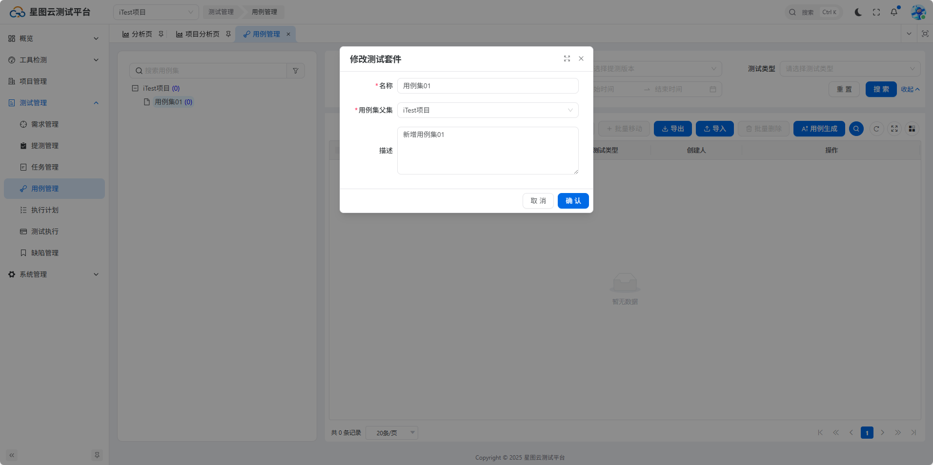 编辑用例集:在左侧用例集树中选中一个节点,单击右键在弹出的列表中点击【编辑】,弹出修改测试套件窗口,修改用例集名称、用例集父集和描述。点击【确认】按钮,用例集修改成功,如下图所示: