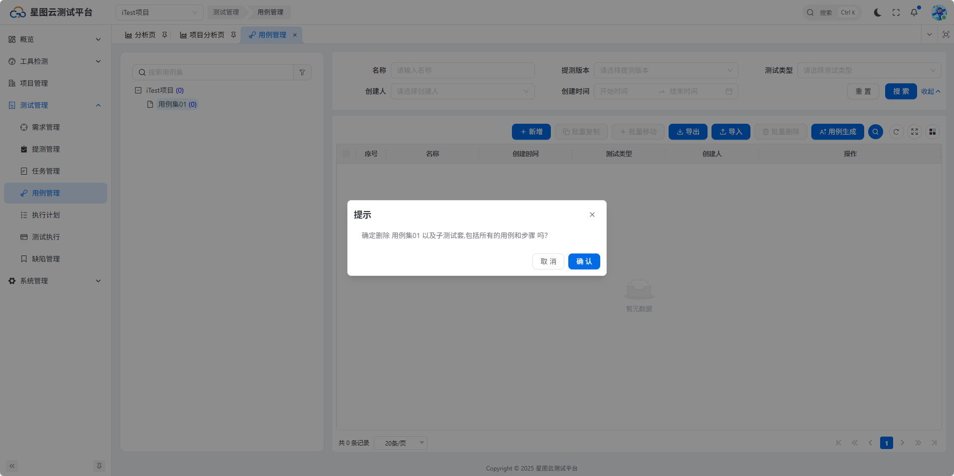 删除用例集:在左侧用例集树中选中一个节点,单击右键在弹出的列表中点击【删除】,弹出二次确认窗口,点击【确认】按钮,用例集删除成功,如下图所示: