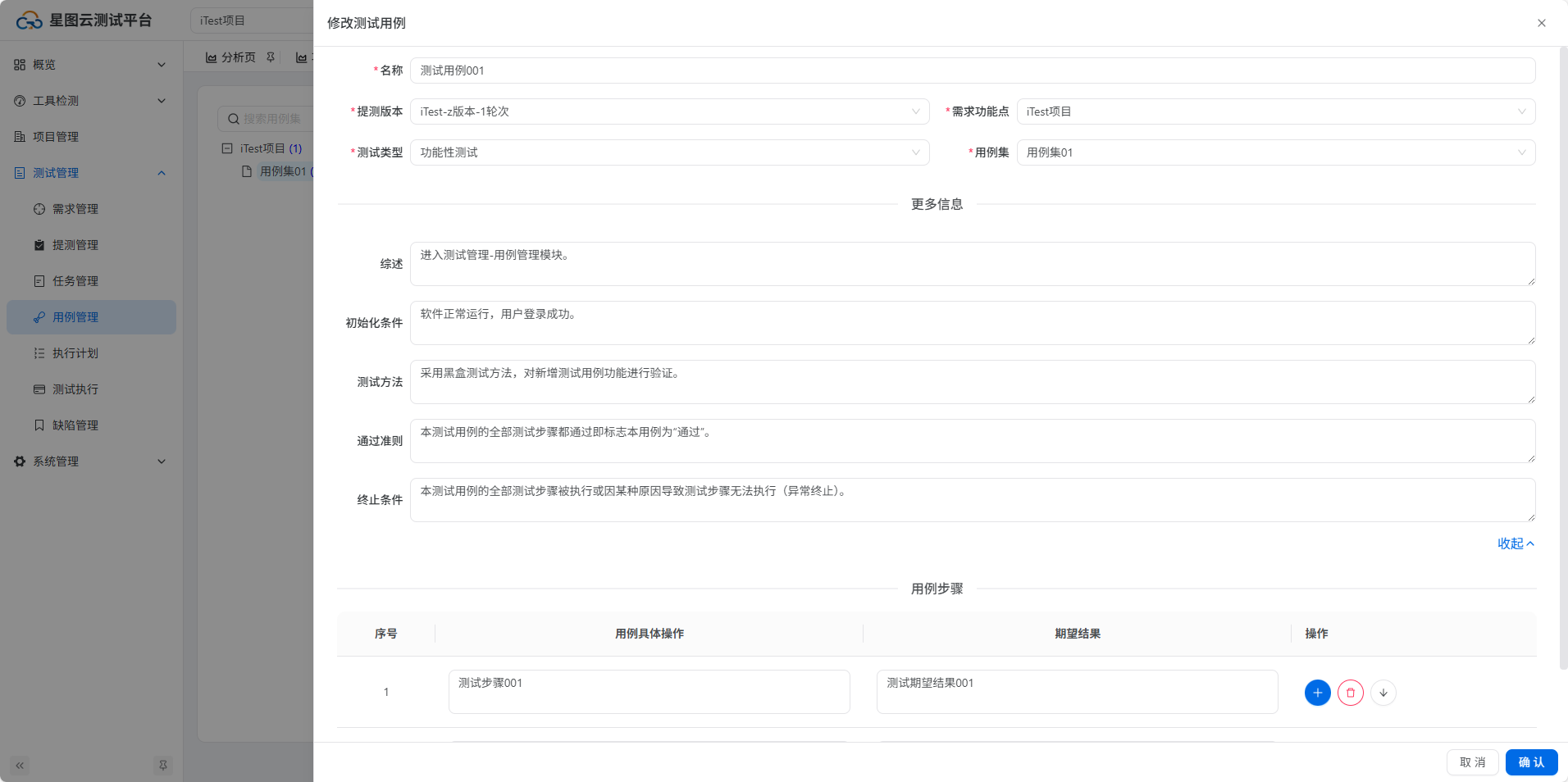 新增用例:在左侧用例集树中,选中某一用例集,点击右侧用例列表的【新增】按钮,弹出新增测试用例窗口,填写用例基本信息和用例步骤,点击【确认】按钮,用例添加成功,如下图所示:
