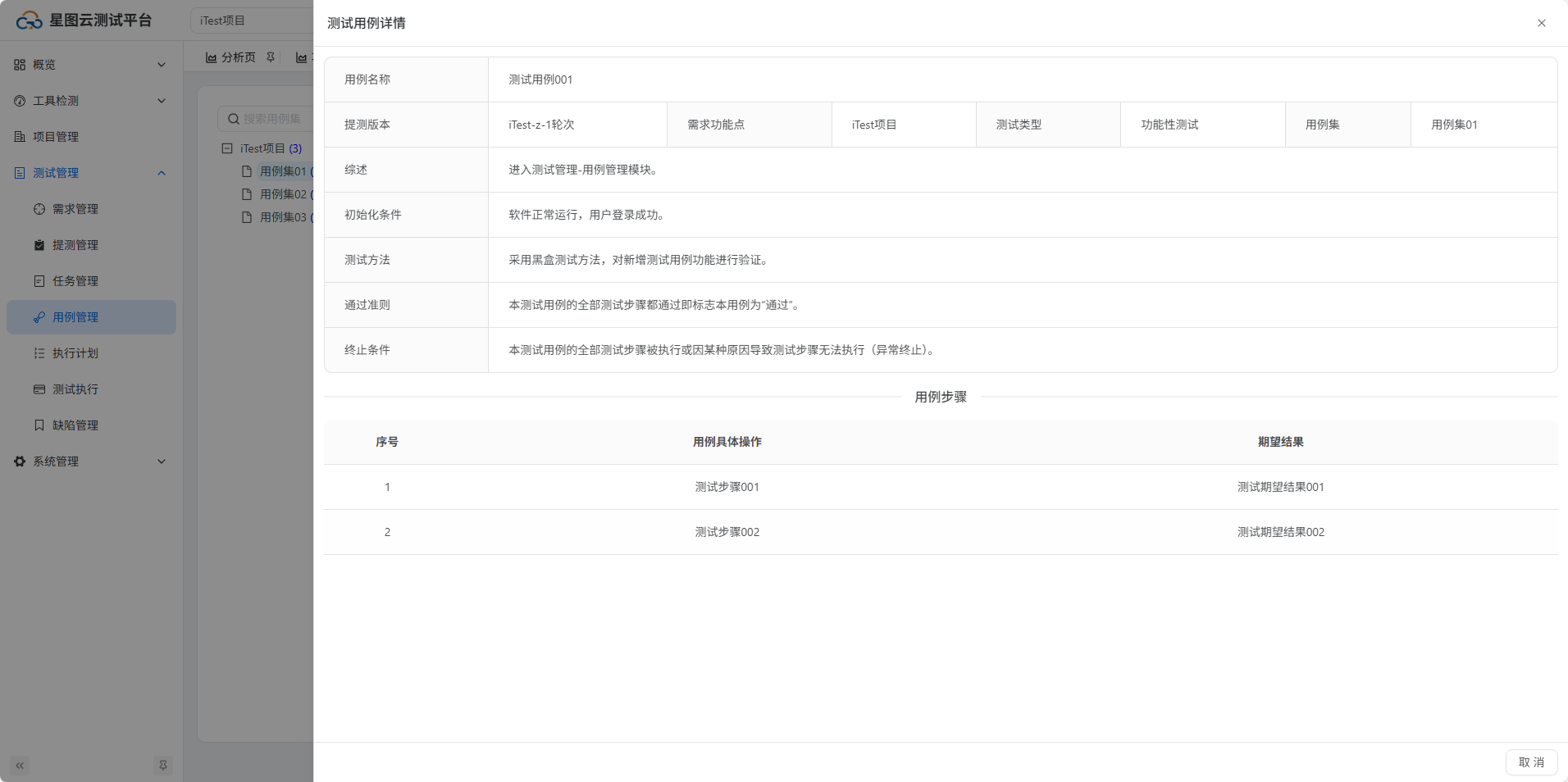 用例详情:在右侧用例列表中,点击【详情】按钮,弹出测试用例详情窗口,查看测试用例的基本信息和用例步骤,如下图所示: