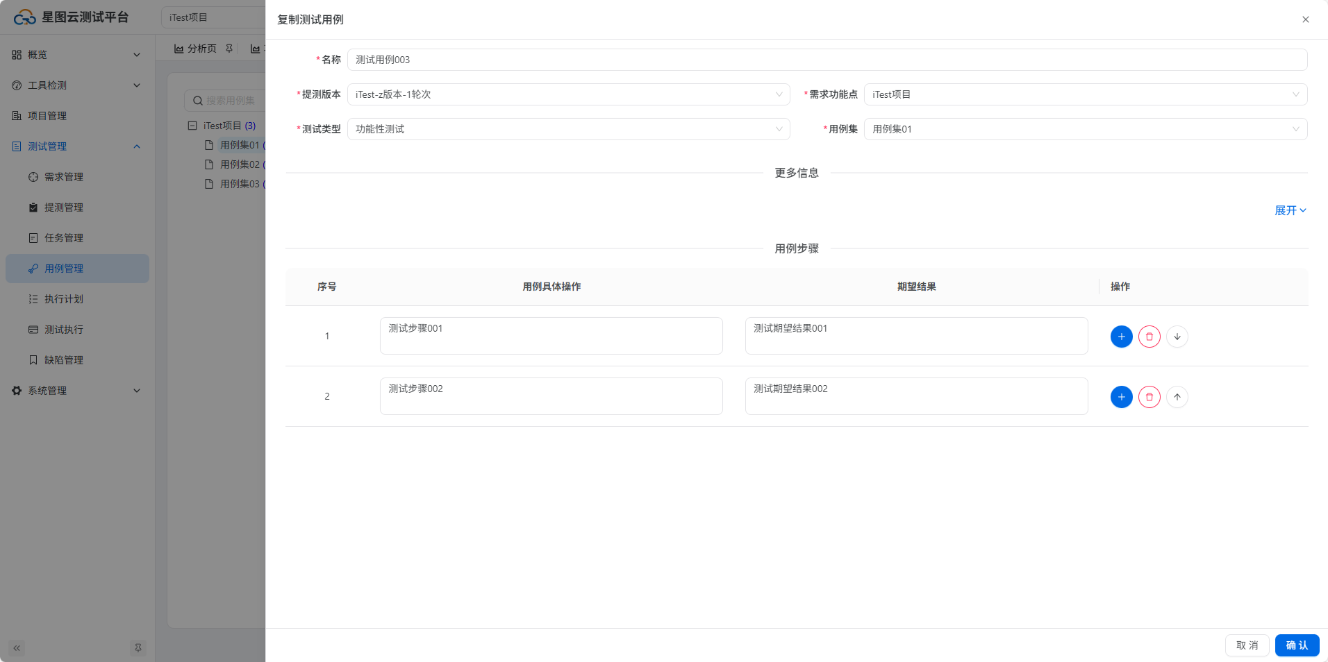 复制用例:在右侧用例列表中,点击【复制】按钮,弹出复制测试用例窗口,修改测试用例的基本信息和用例步骤,点击【确认】按钮,测试用例复制成功,如下图所示: