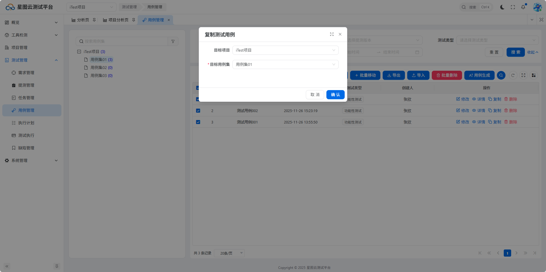 批量复制用例:在右侧用例列表中,勾选待批量复制的测试用例,点击【批量复制】按钮,弹出复制测试用例窗口中输入目标项目、目标用例集,点击【确认】按钮,测试用例批量复制成功,如下图所示: