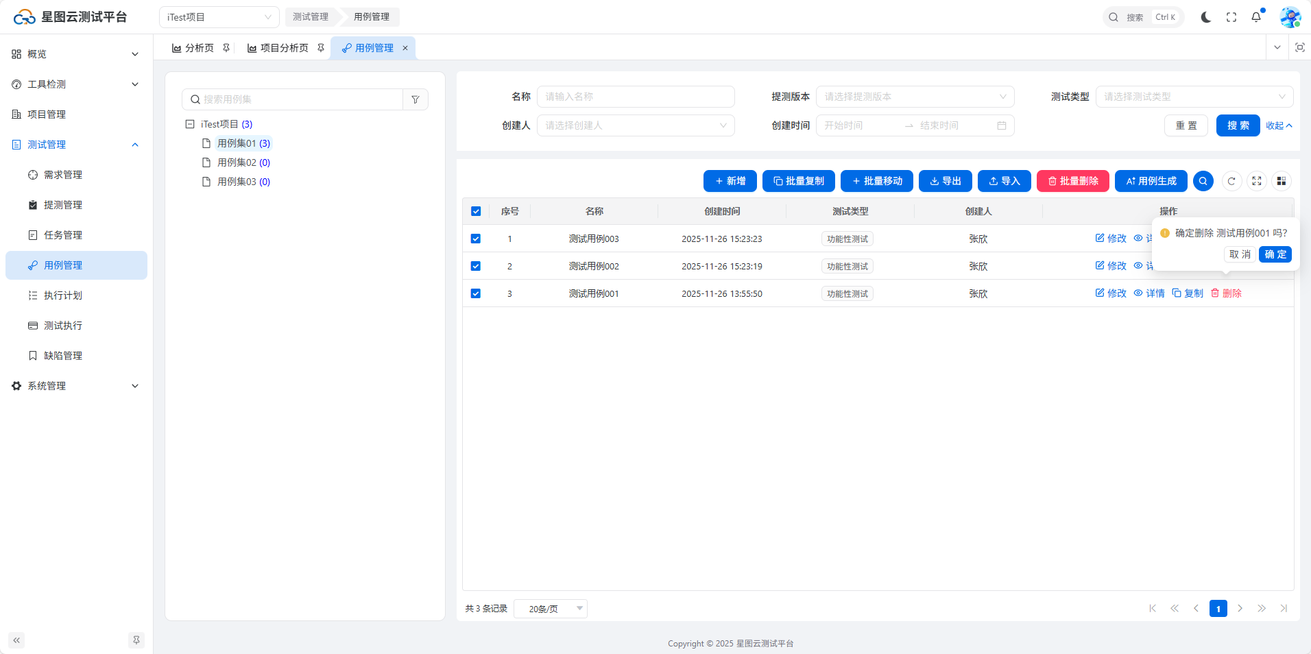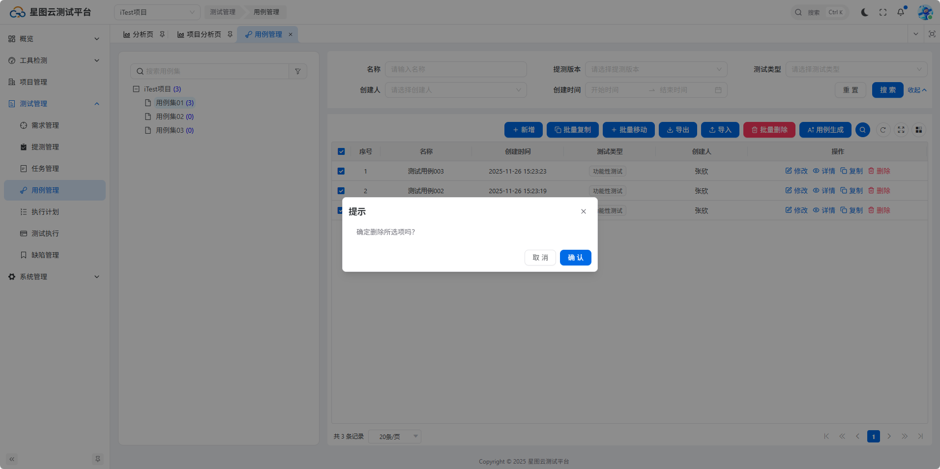 批量删除用例:在右侧用例列表中,勾选待批量删除的测试用例,点击【批量删除】按钮,弹出二次确认窗口,点击【确认】按钮,用例批量删除成功,如下图所示: