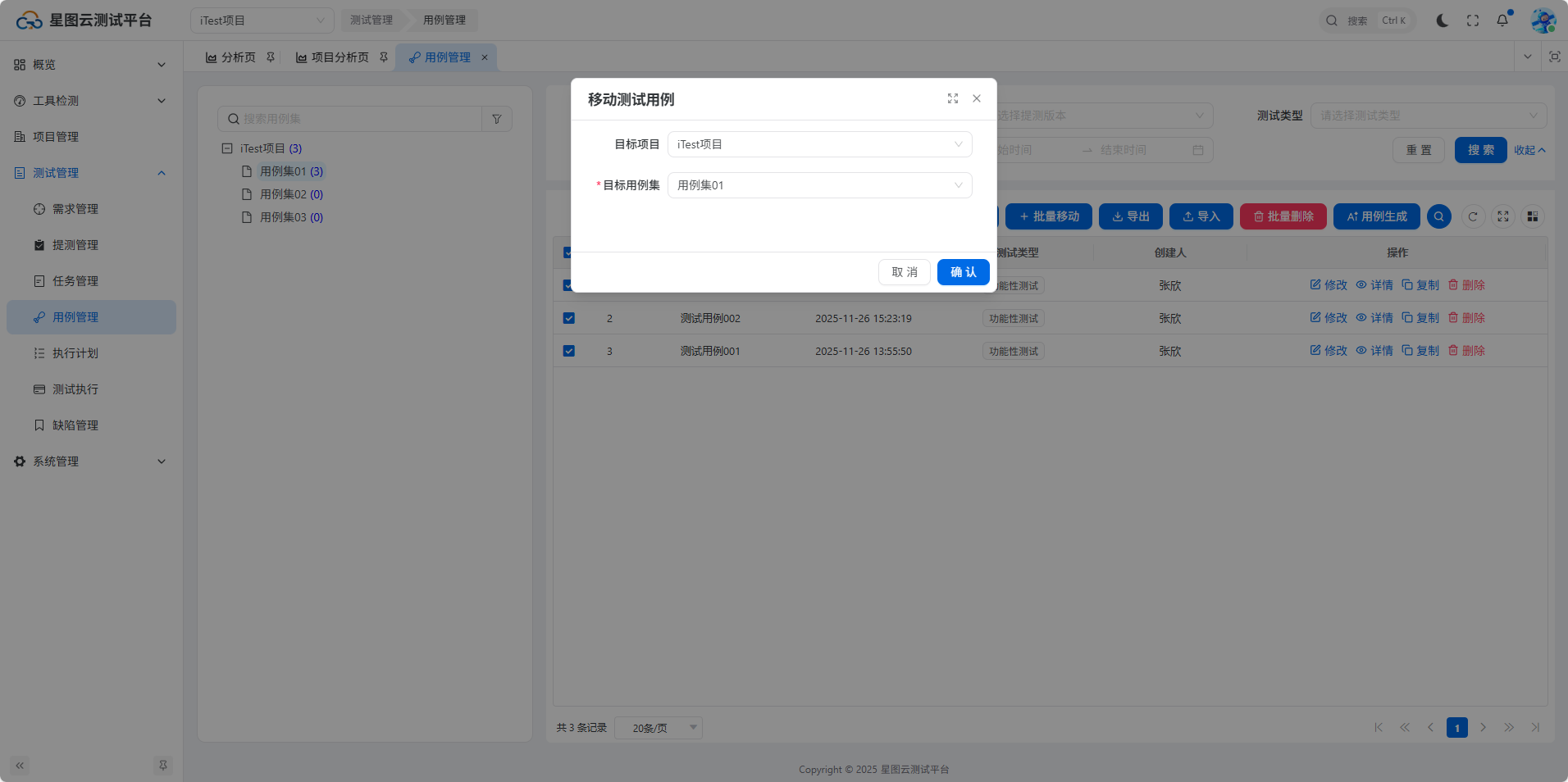批量移动用例:在右侧用例列表中,勾选待批量移动的测试用例,点击【批量移动】按钮,弹出移动测试用例窗口输入目标项目、目标用例集,点击【确认】按钮,用例批量移动成功,如下图所示: