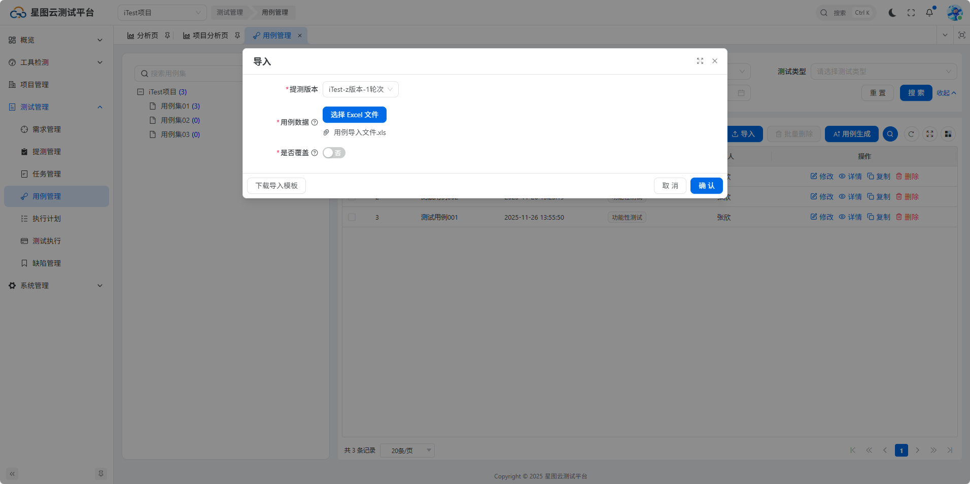 导入用例:在右侧用例列表中,点击【导入】按钮,弹出导入窗口,选择提测版本、上传Excel用例数据文件、勾选是否覆盖,点击【确认】按钮,用例导入成功,如下图所示: