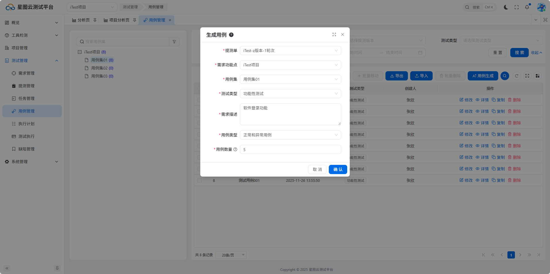 AI用例生成:在右侧用例列表中,点击【AI用例生成】按钮,弹出生成用例窗口,输入基本信息及需求描述、用例类型、用例数量,点击【确认】按钮,等待若干时间即可生成用例,如下图所示: