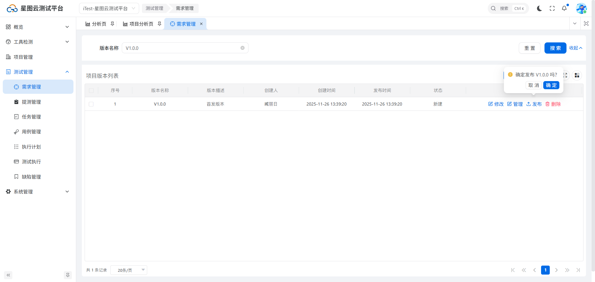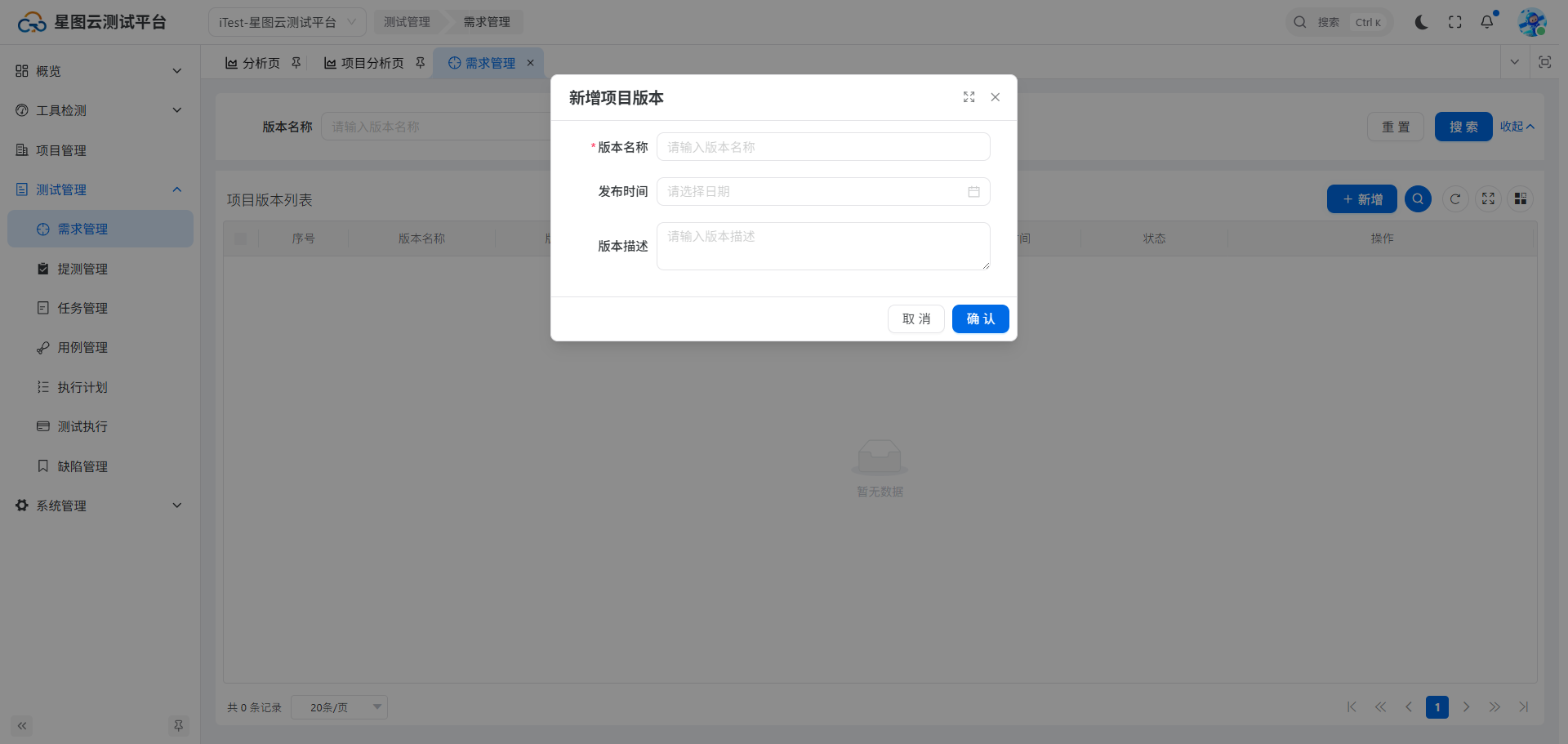 新增需求版本:点击【新增】按钮,弹出新增项目版本窗口,填写版本名称、发布时间和版本描述,点击【确认】按钮,版本添加成功,如下图所示: