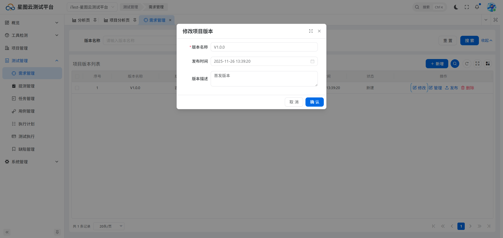 编辑需求版本:在版本列表中,点击【修改】按钮,弹出修改项目版本窗口,修改版本名称、发布时间和版本描述,点击【确认】按钮,版本修改成功,如下图所示: