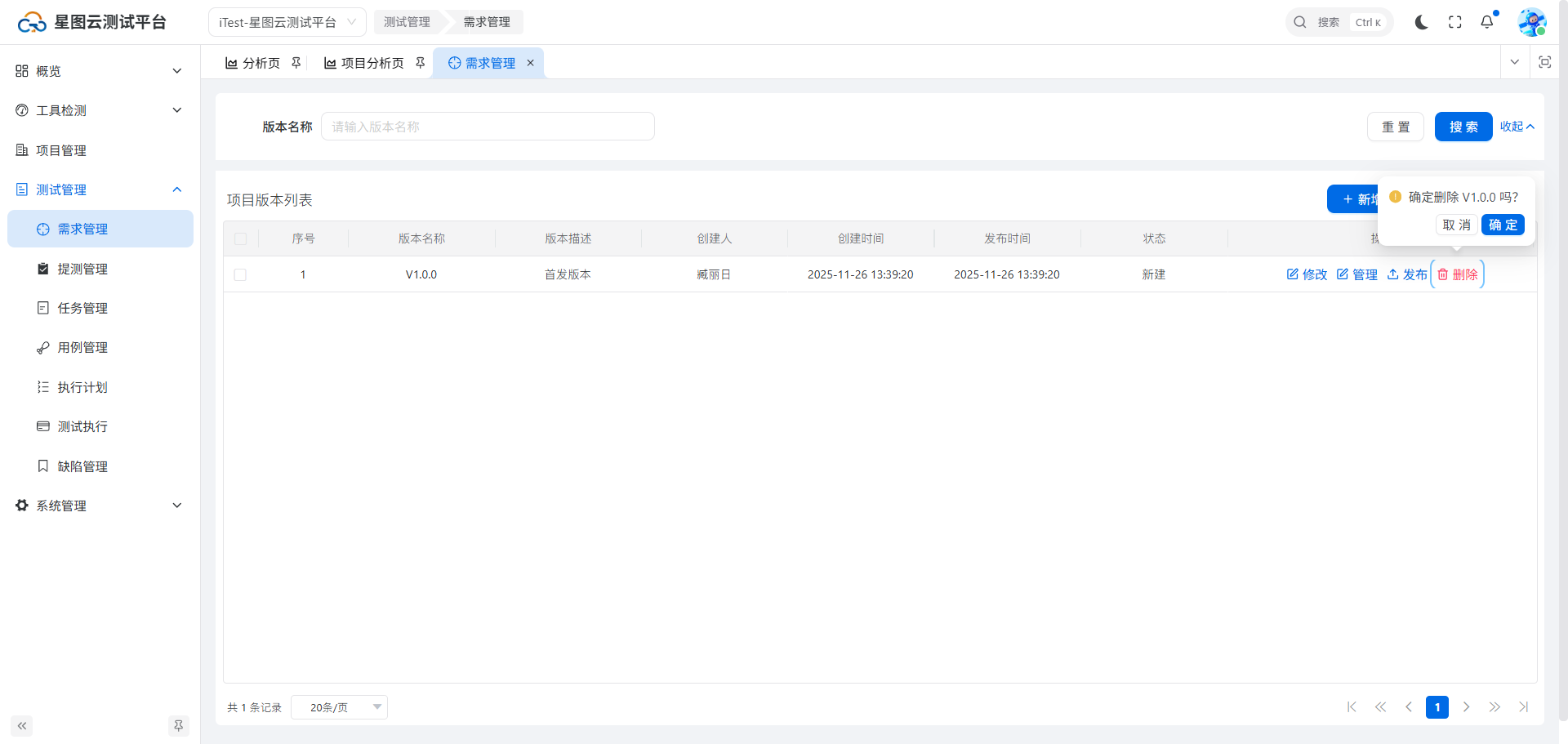 删除需求版本:在项目版本列表中,点击【删除】按钮,弹出二次确认窗口,点击【确定】,版本删除成功,如下图所示: