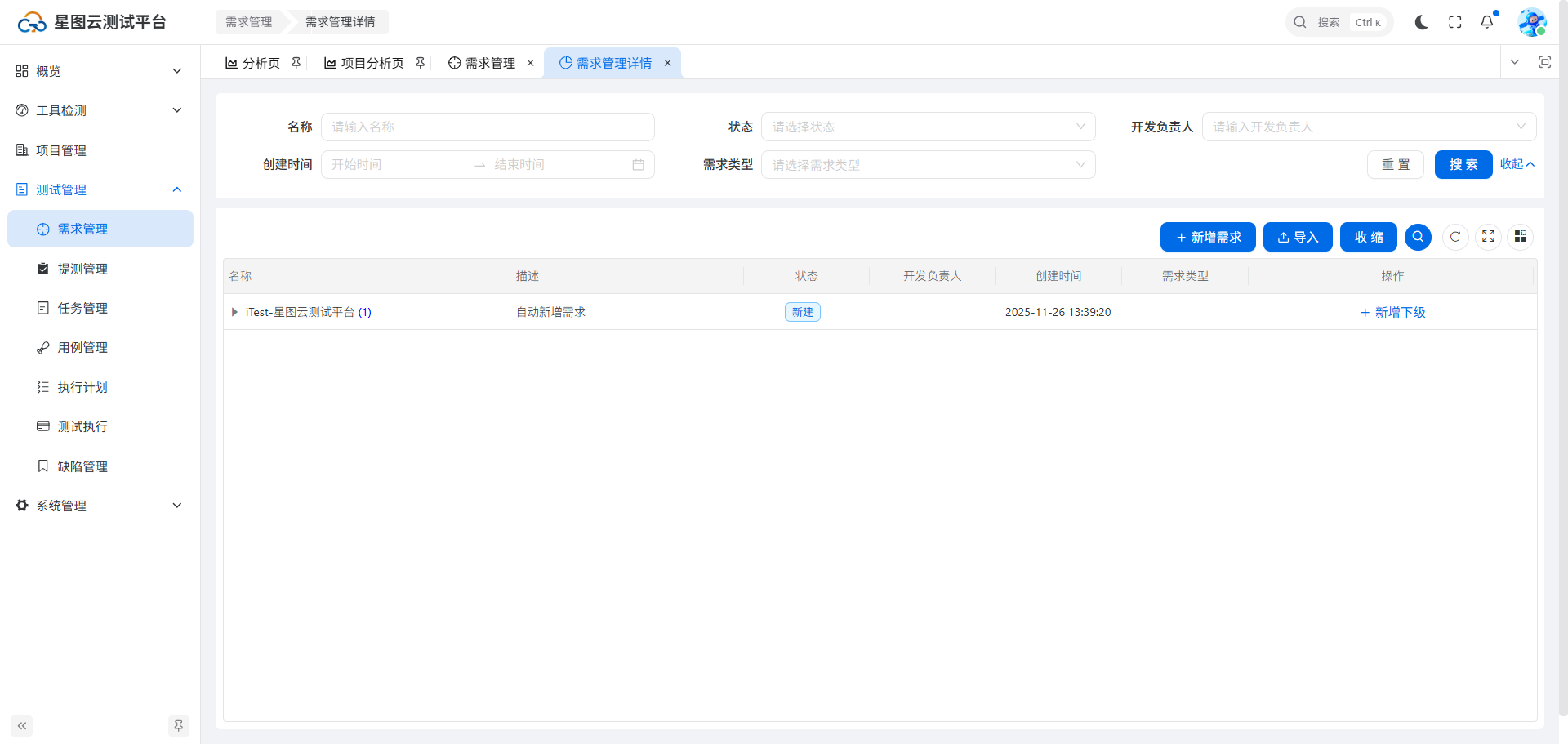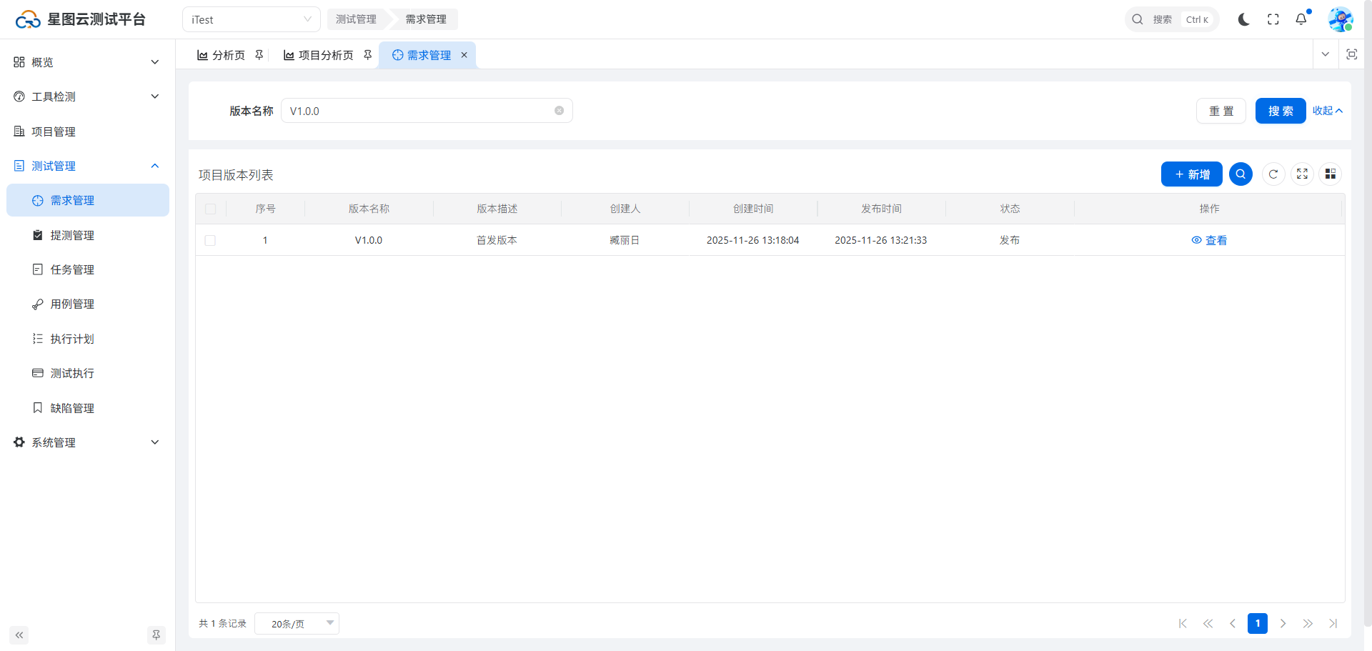 用户可以从左侧导航【测试管理】下的【需求管理】,进入需求管理页面。需求管理操作包括需求版本的新增、编辑、删除、发布、查询和需求点的管理。