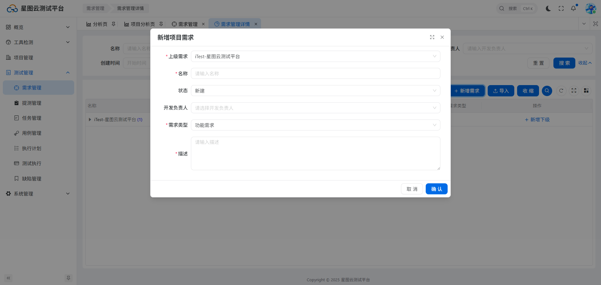新增需求点:点击【新增需求】/【新增下级】按钮,弹出新增项目需求窗口,录入功能点信息,点击【确认】按钮,功能点新增成功,如下图所示: