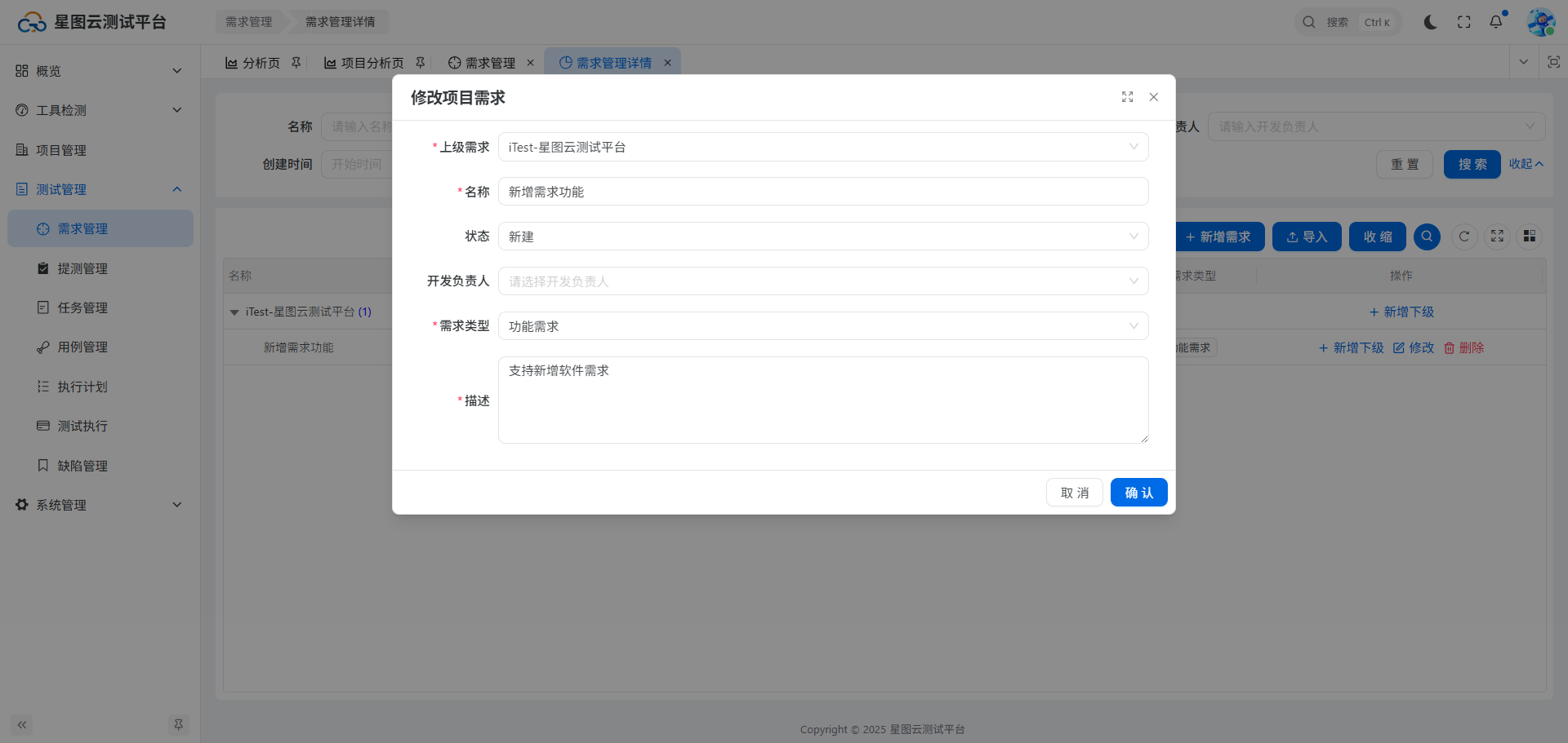 编辑需求点:在需求列表中,点击功能点对应的【修改】按钮,弹出修改项目需求窗口,对该功能点信息进行编辑,点击【确认】按钮,功能点修改成功,如下图所示: