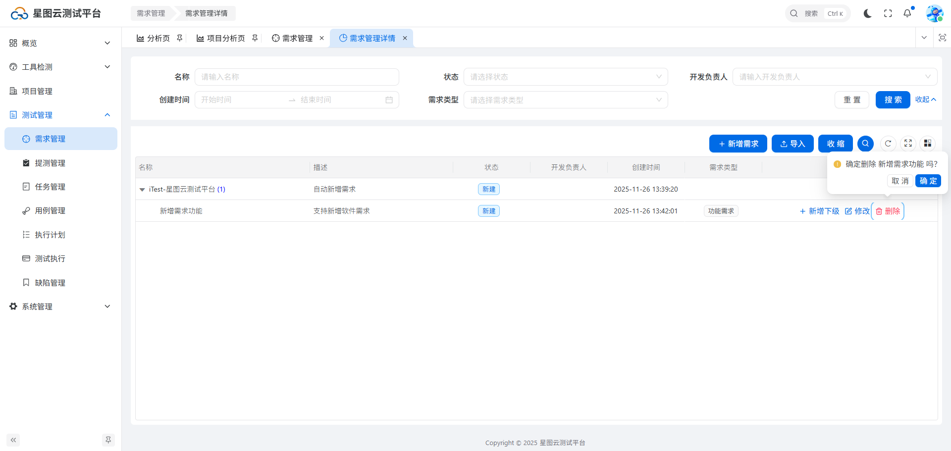 删除需求点:在需求列表中,点击功能点对应的【删除】按钮,弹出二次确认窗口,点击【确定】按钮,功能点删除成功,如下图所示: