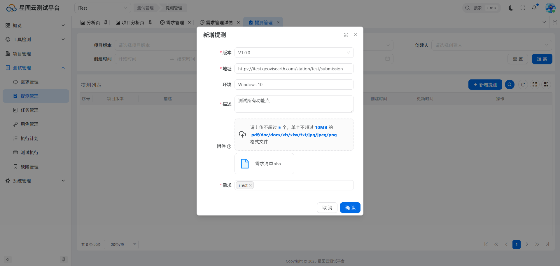 新增提测单:点击【新增】按钮,弹出新增提测单窗口,选择版本,填写地址、环境和描述,上传附件,在需求中勾选本次提测的功能点,点击【确认】按钮,提测单添加成功,如下图所示: