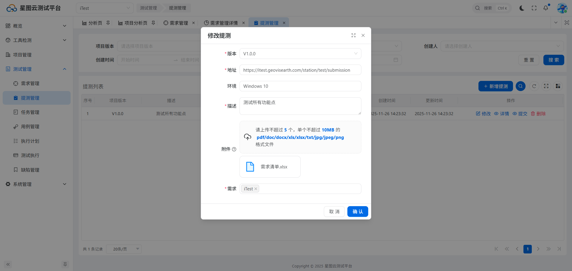编辑提测单:在提测单列表中,点击提测单对应的【修改】按钮,弹出修改提测单窗口,修改提测单基本信息(如:版本、地址、环境、任务)、新增或删除附件,重新勾选需要测试的功能点,点击【确认】按钮,提测修改单成功,如下图所示: