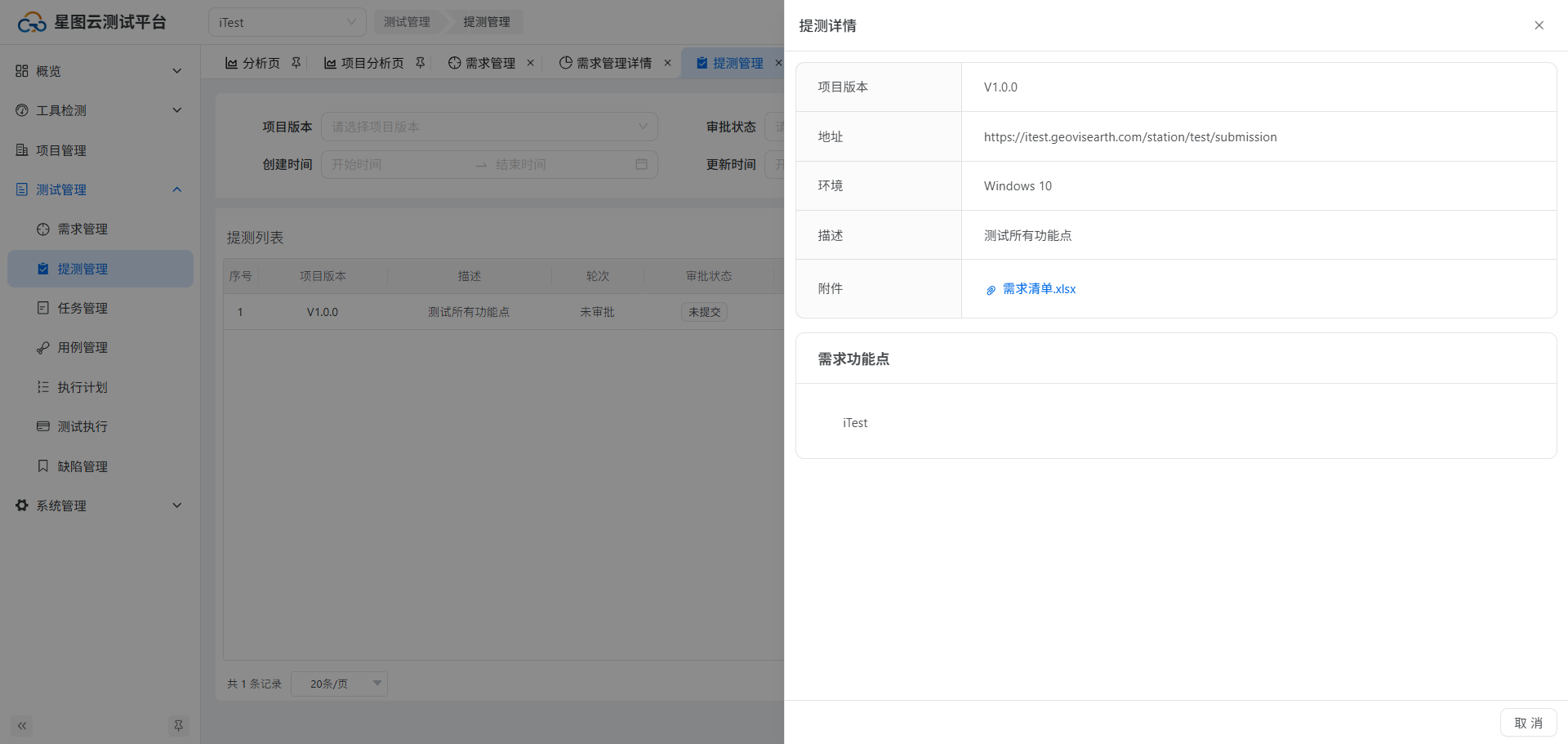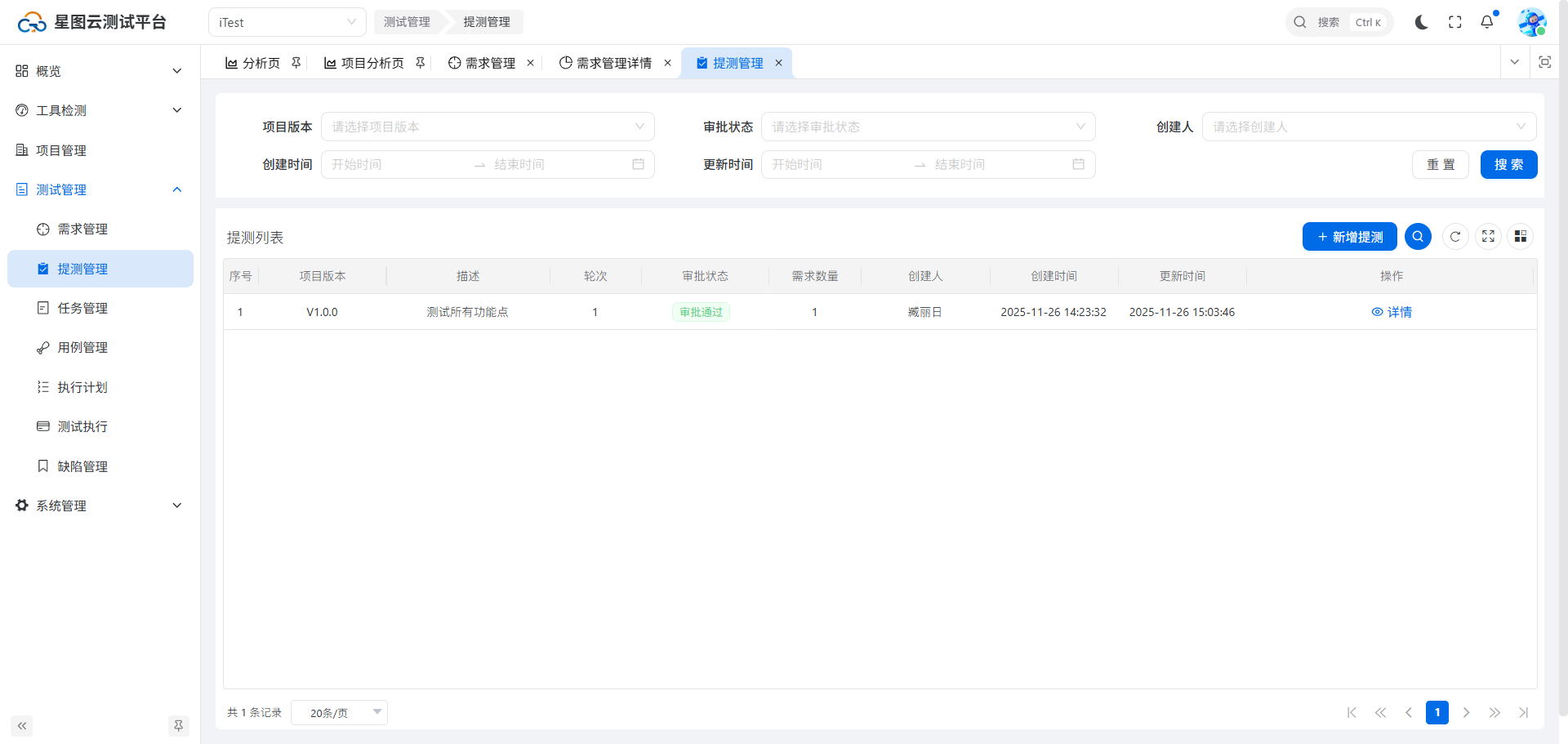 用户可以从左侧导航【测试管理】下的【提测管理】,进入提测管理页面。提测管理操作包括提测单的新增、编辑、查看、删除、查询、提交和审批。