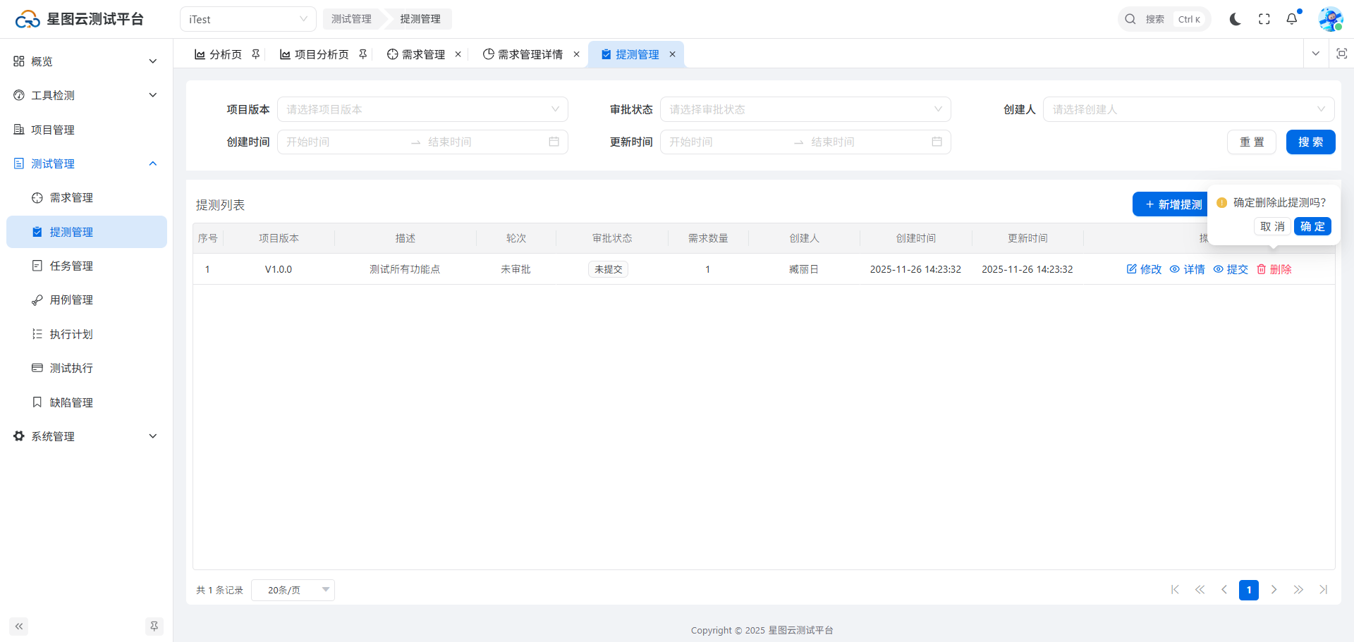 删除提测单:在提测单列表中,点击提测单对应的【删除】按钮,弹出二次确认窗口,点击【确定】按钮,提测单删除成功,如下图所示: