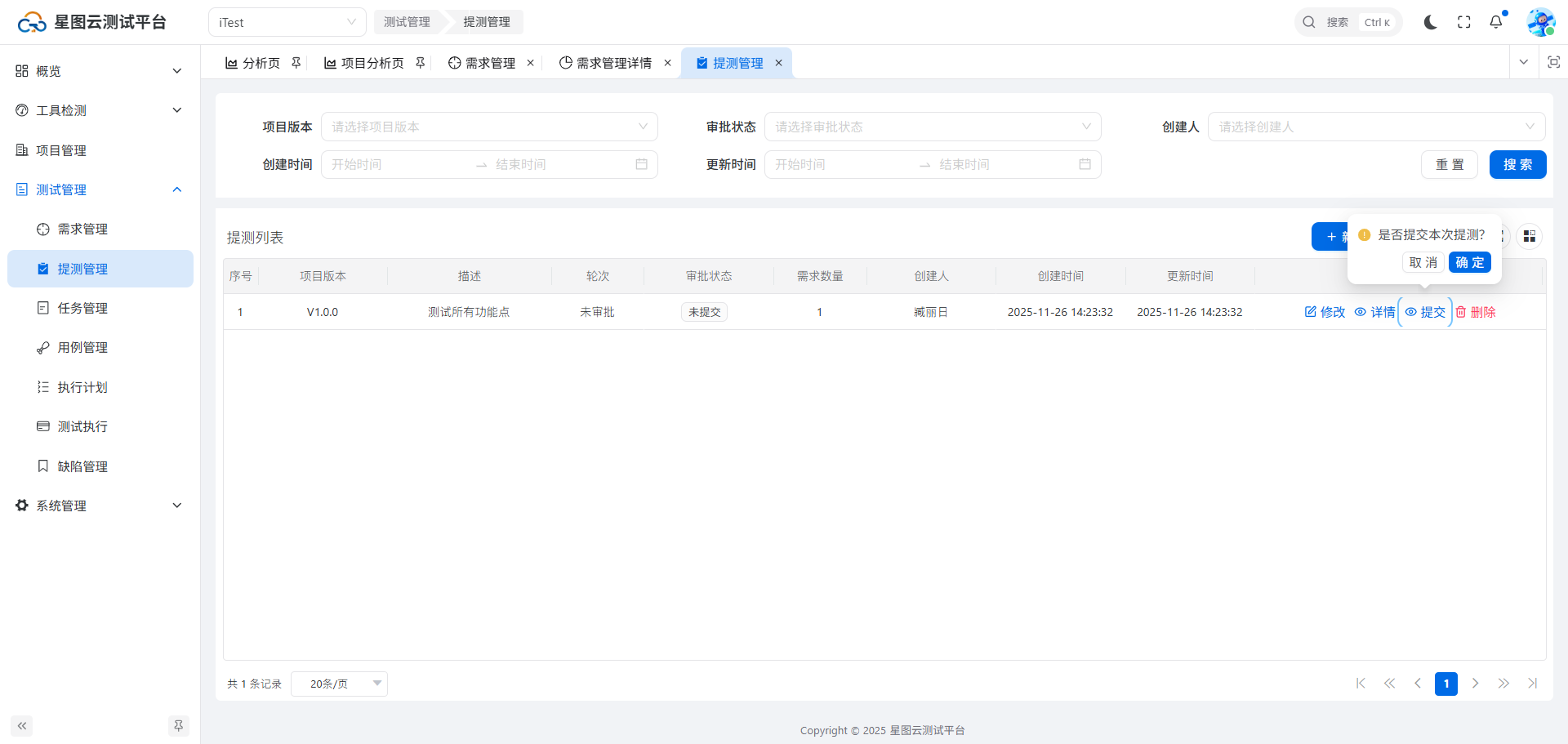 提交提测单:在提测单列表中,点击未提交状态的提测单对应的【提交】按钮,弹出二次确认窗口,点击【确定】按钮,提测单提交成功,如下图所示: