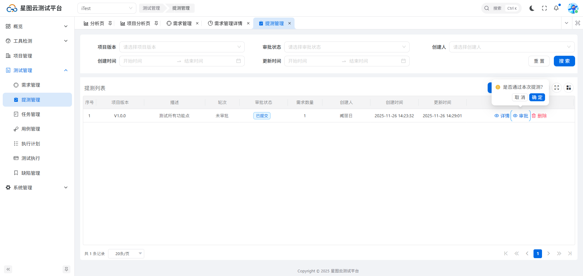 审批提测单:在提测单列表中,提交成功的提测单可以进行【审批】操作,点击【审批】按钮,弹出二次确认窗口,点击【确定】按钮,提测单审批通过,如下图所示: